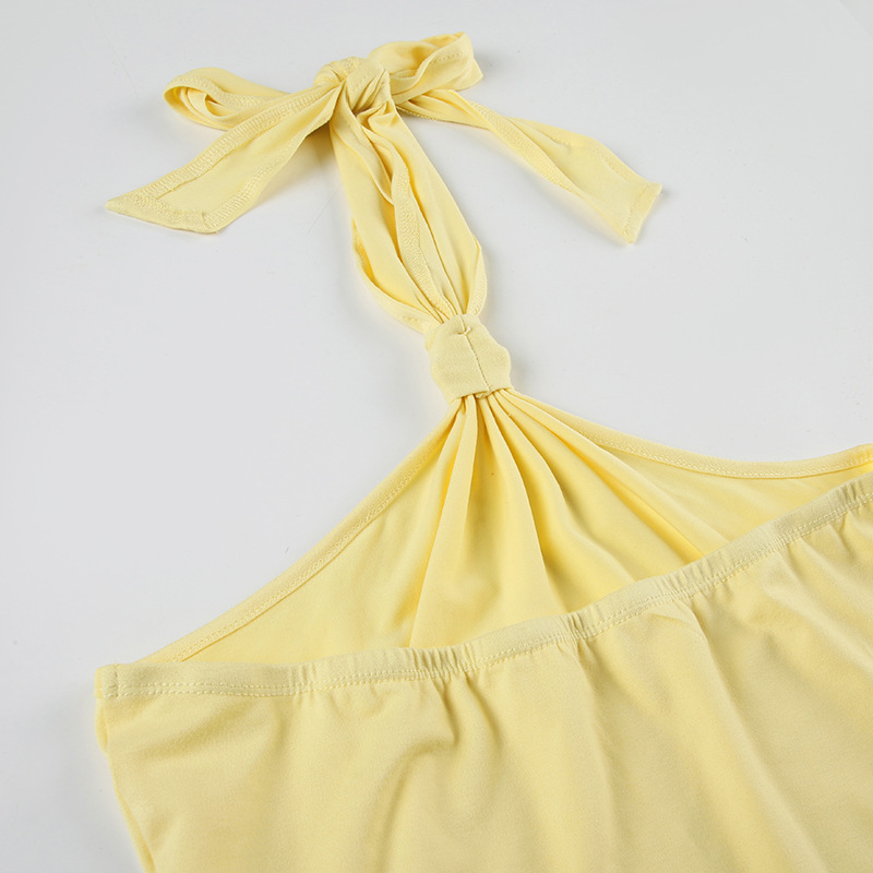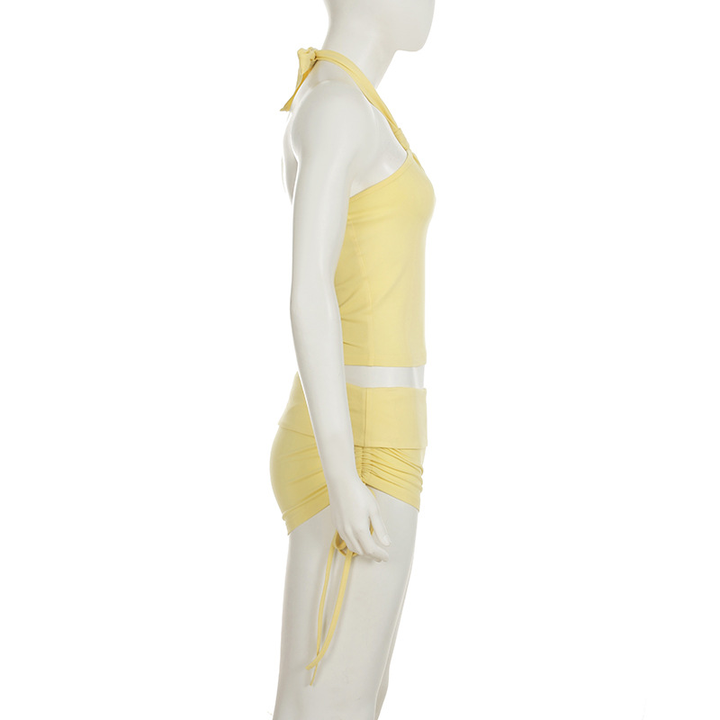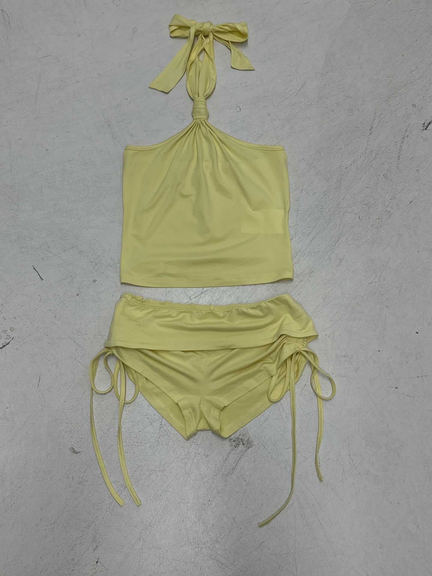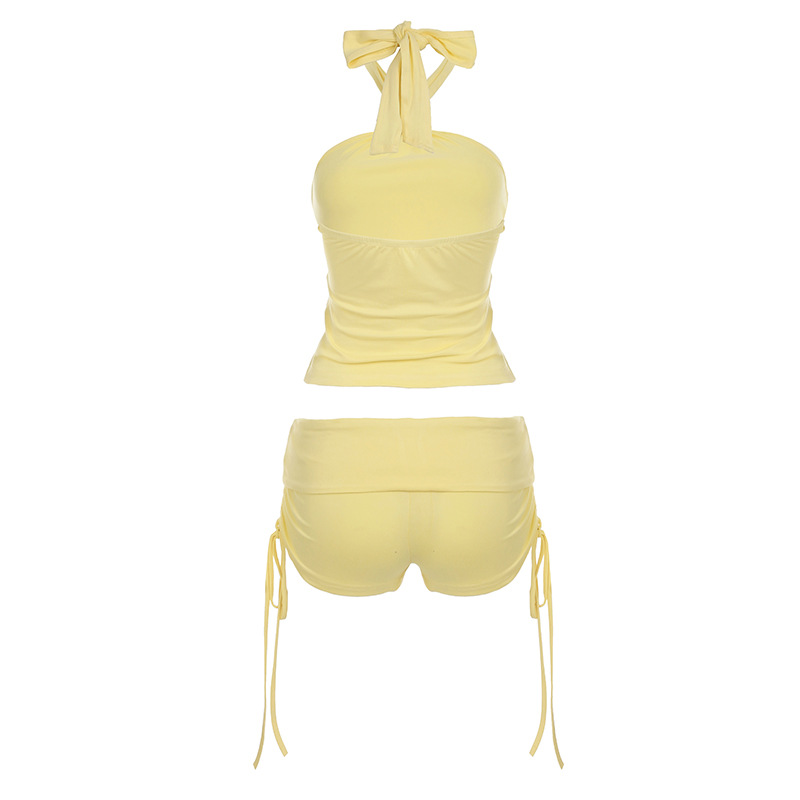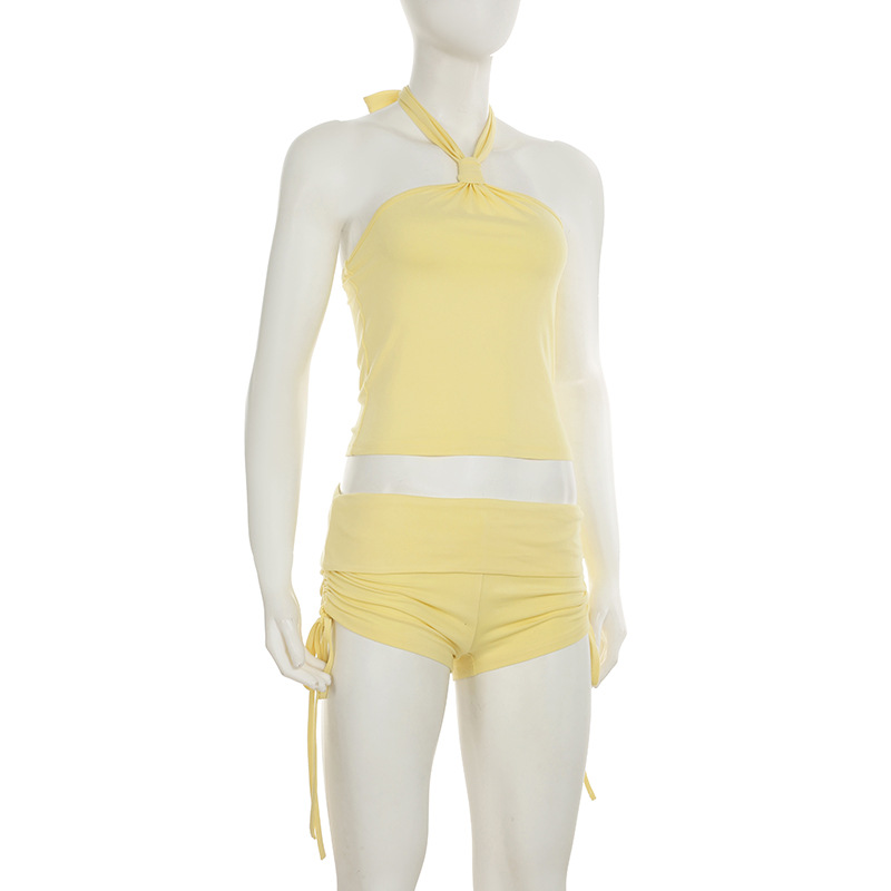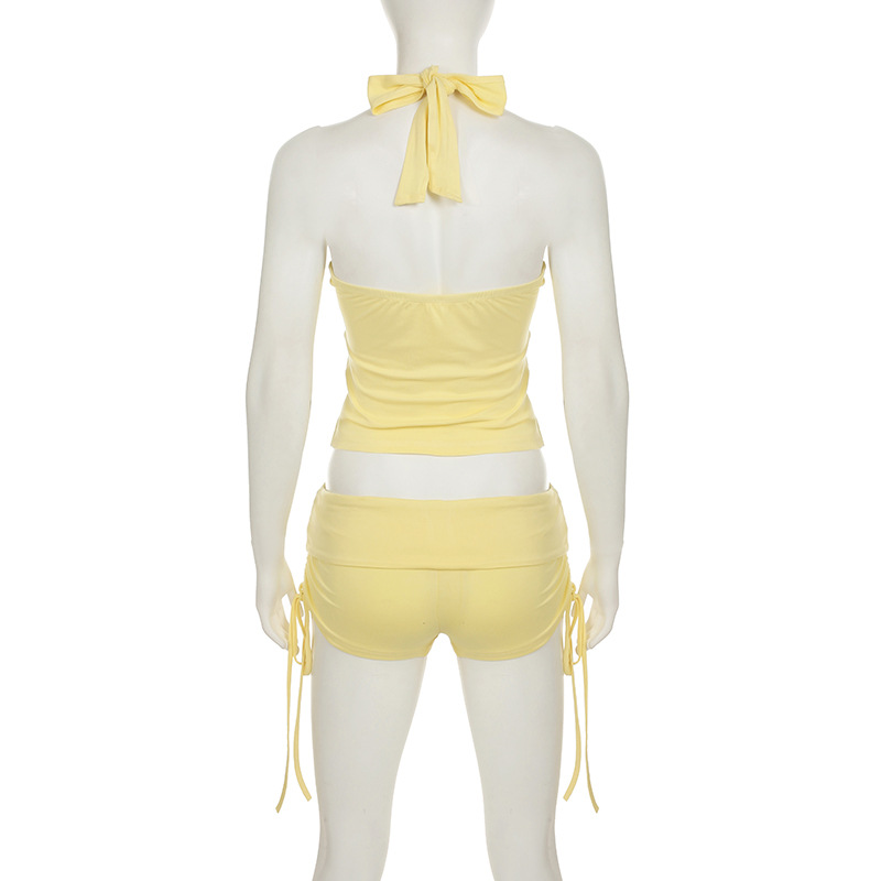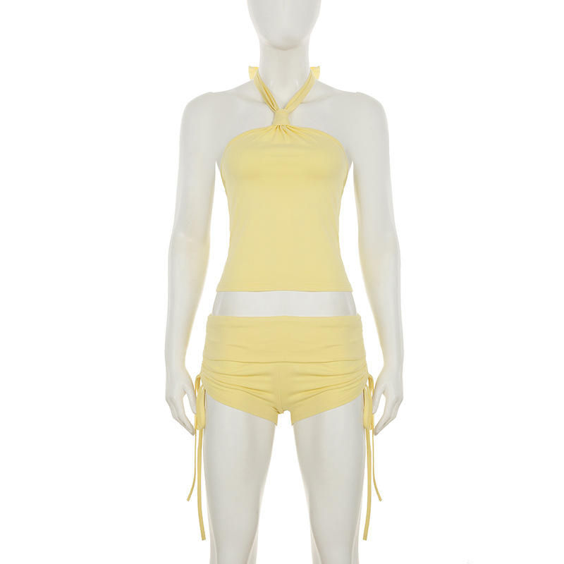 Summer Casual Women Sexy Twisted Halterneck Vest Waist Drawstring Lace up Shorts Two Piece Set