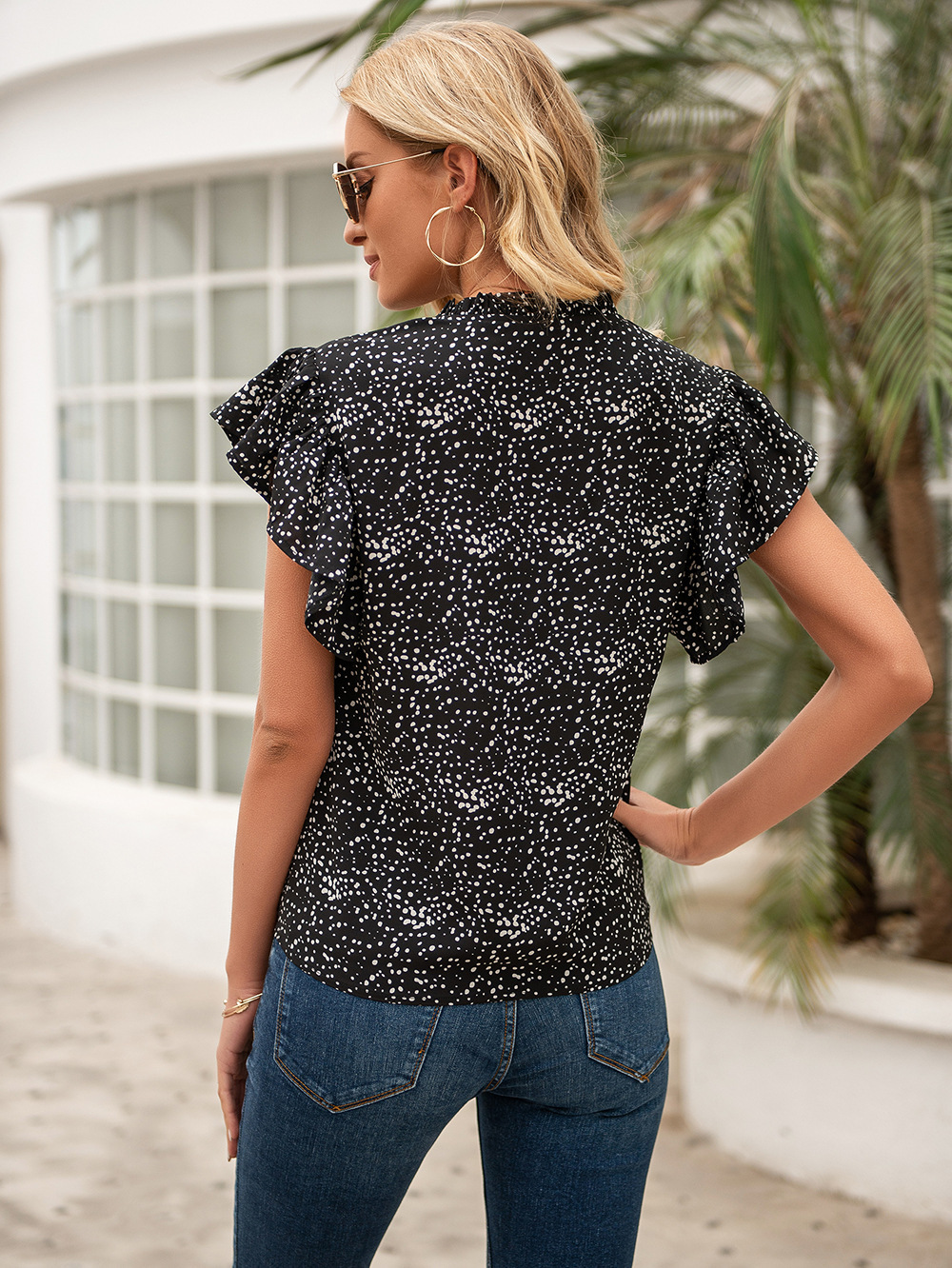 Summer Elegant Ruffle Sleeve Polka Dot Printed Short Sleeve Light Mature Woman Top