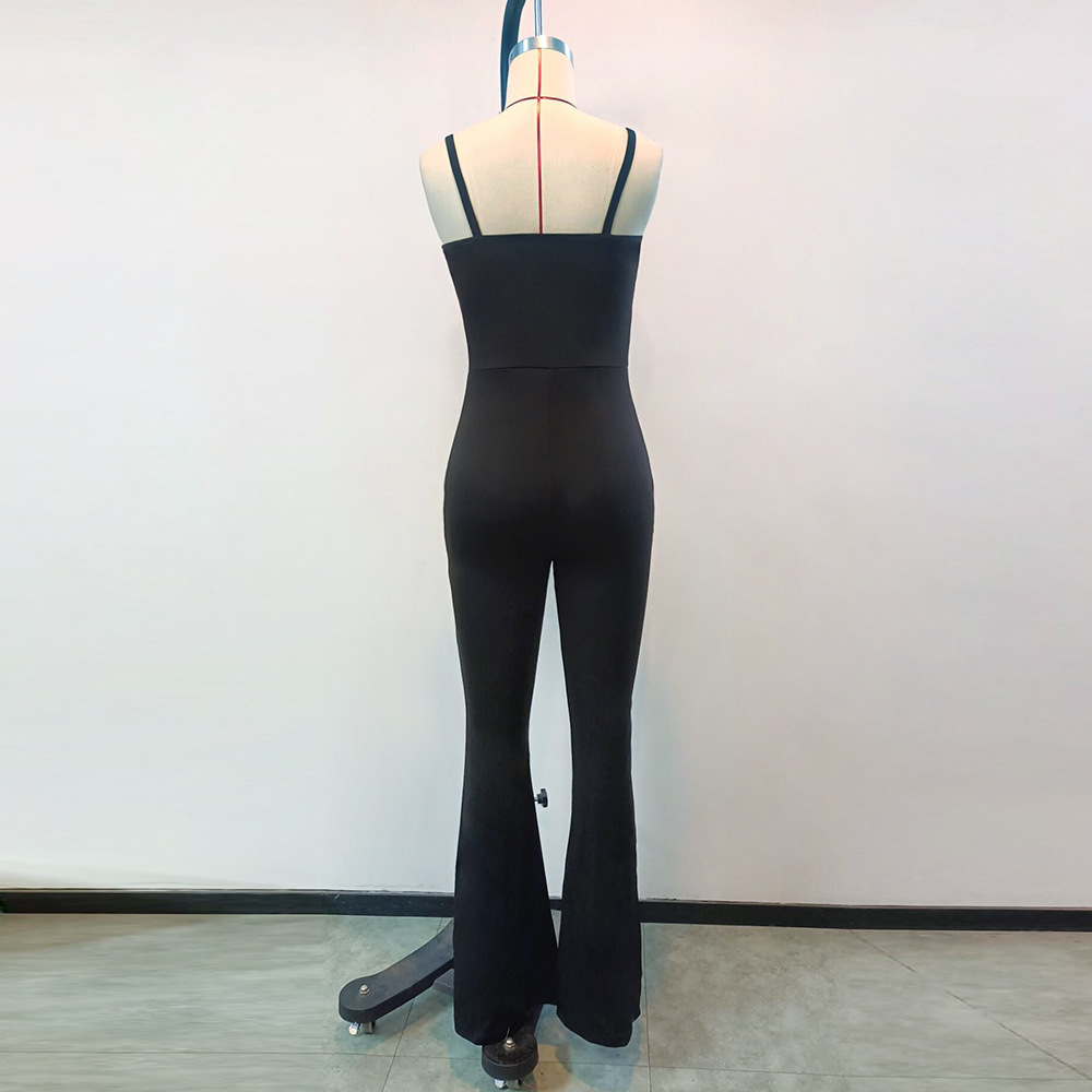 Summer Strap Stitching Mesh Sexy Solid Color Bell-Bottom Slim Fit Bodysuit Jumpsuit