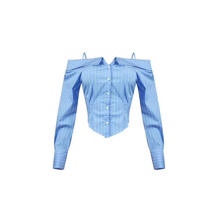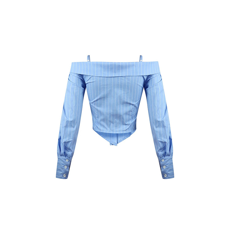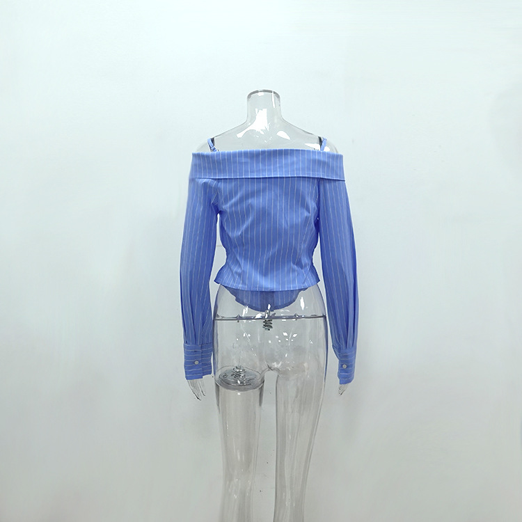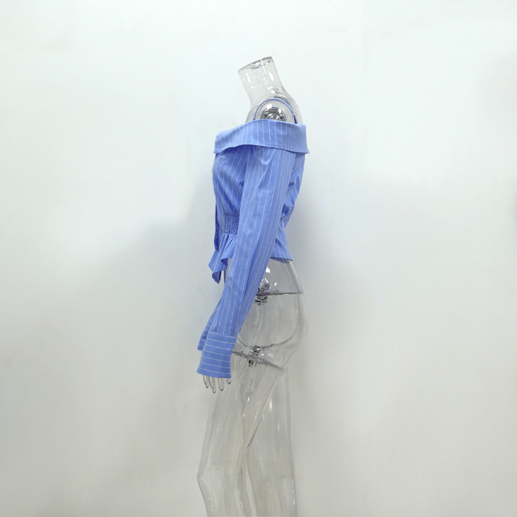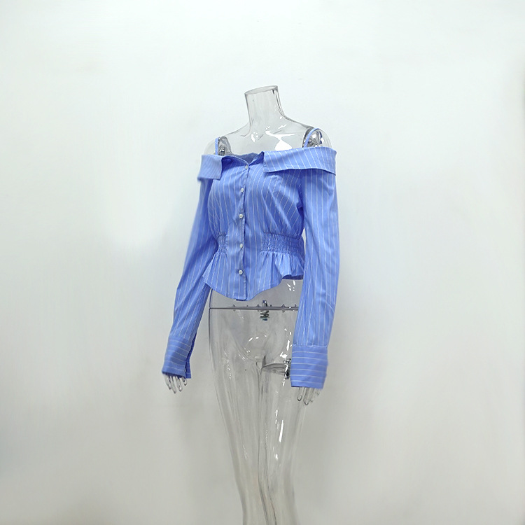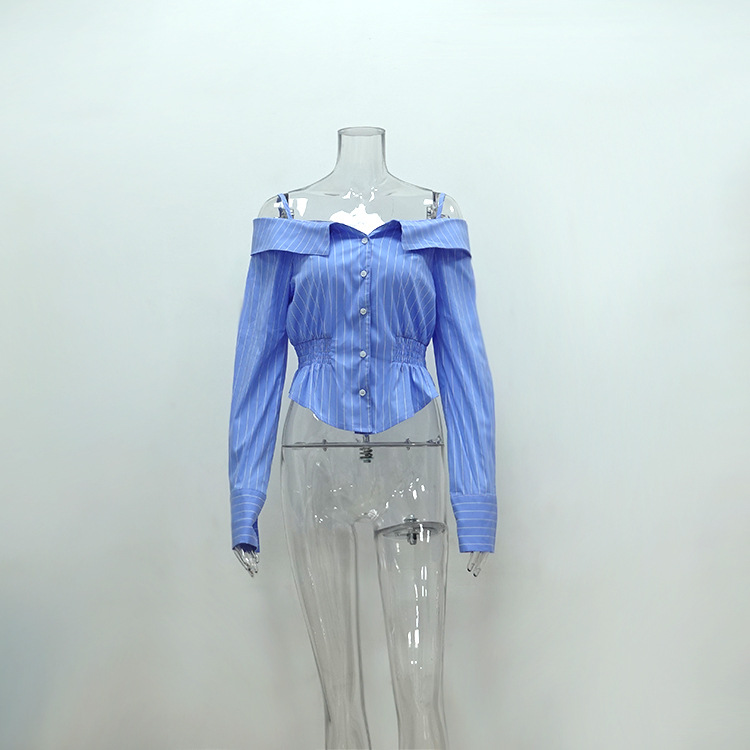 Summer Striped Shirt Women Niche Long Sleeve off Shoulder off the Shoulder Strap Sexy Sexy Top All Matching
