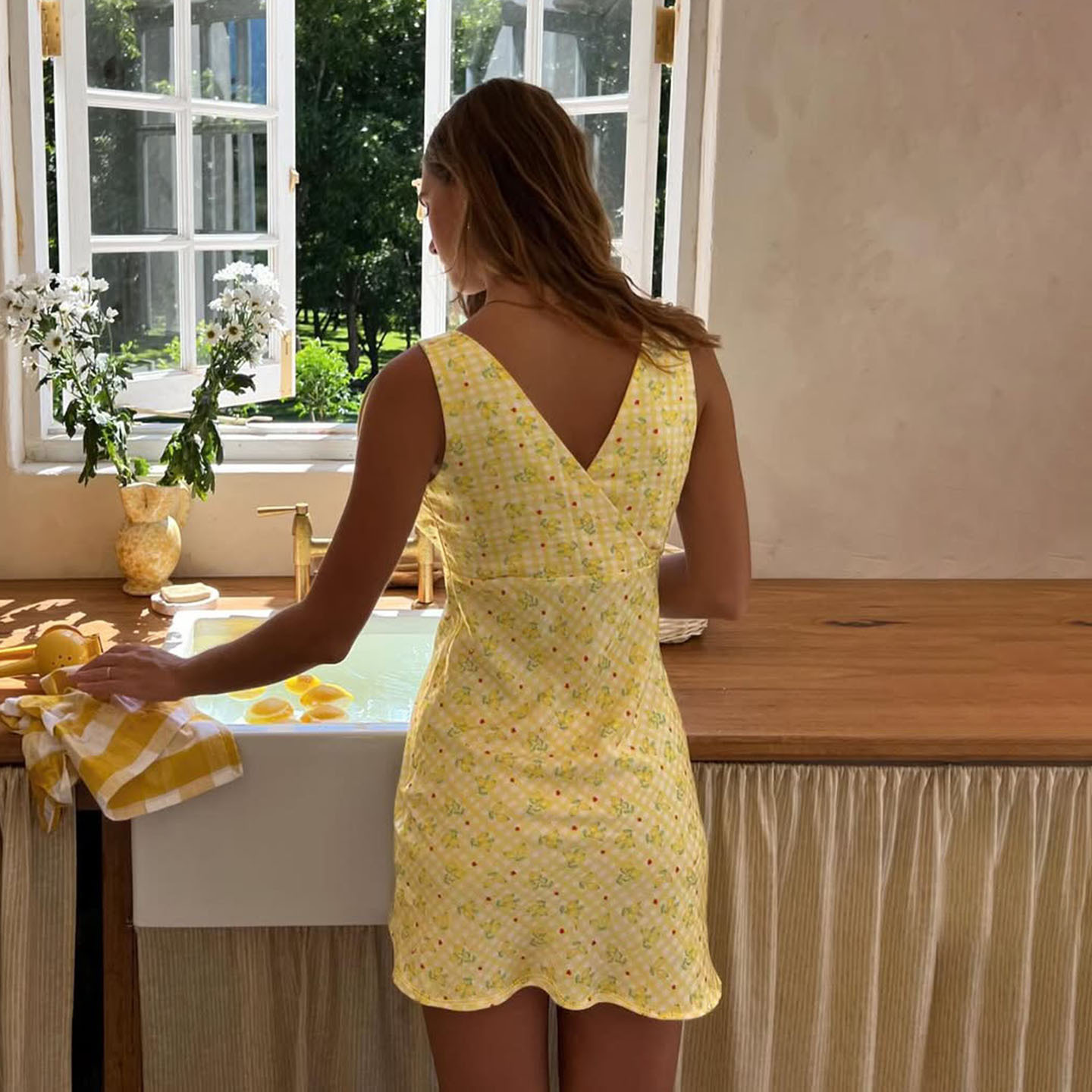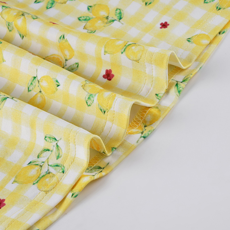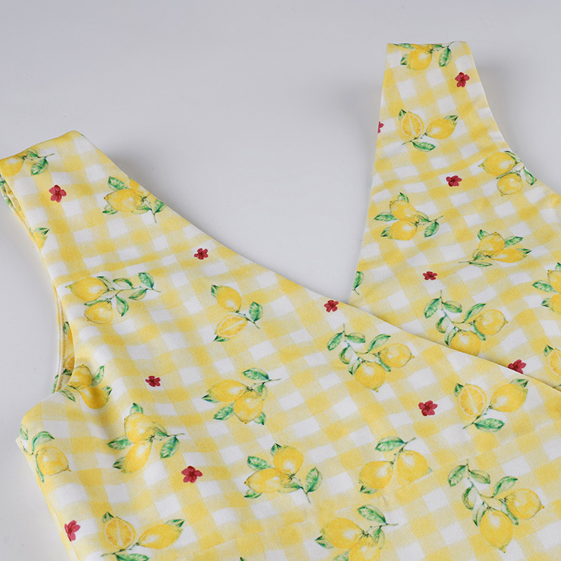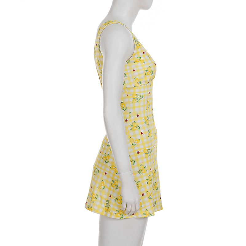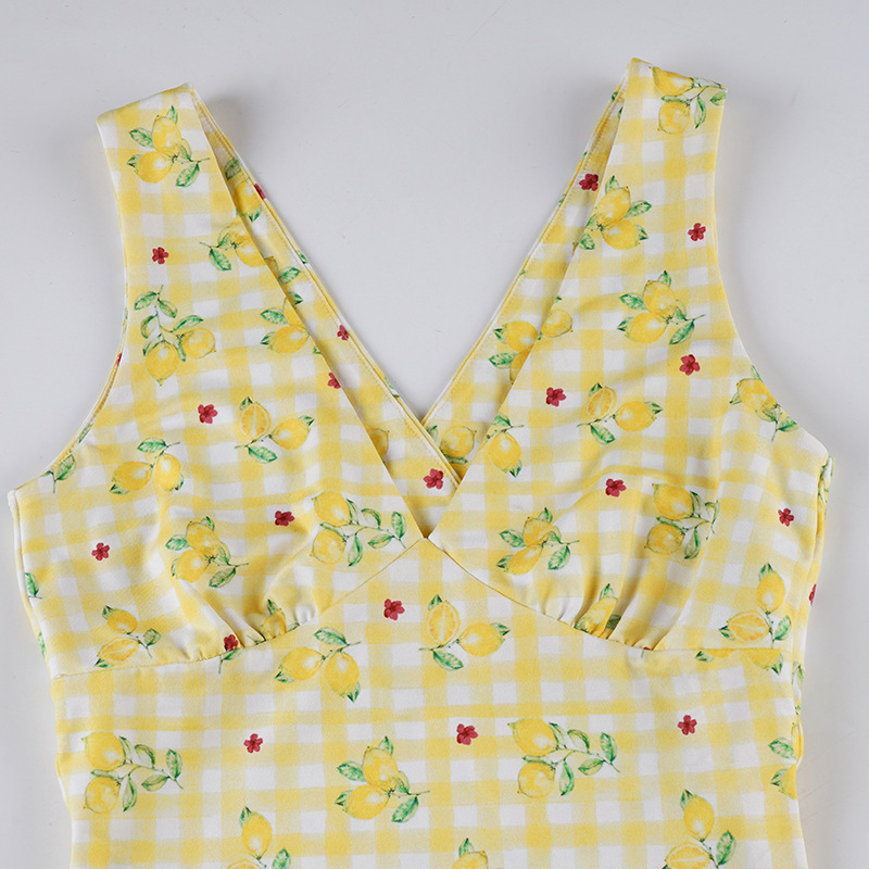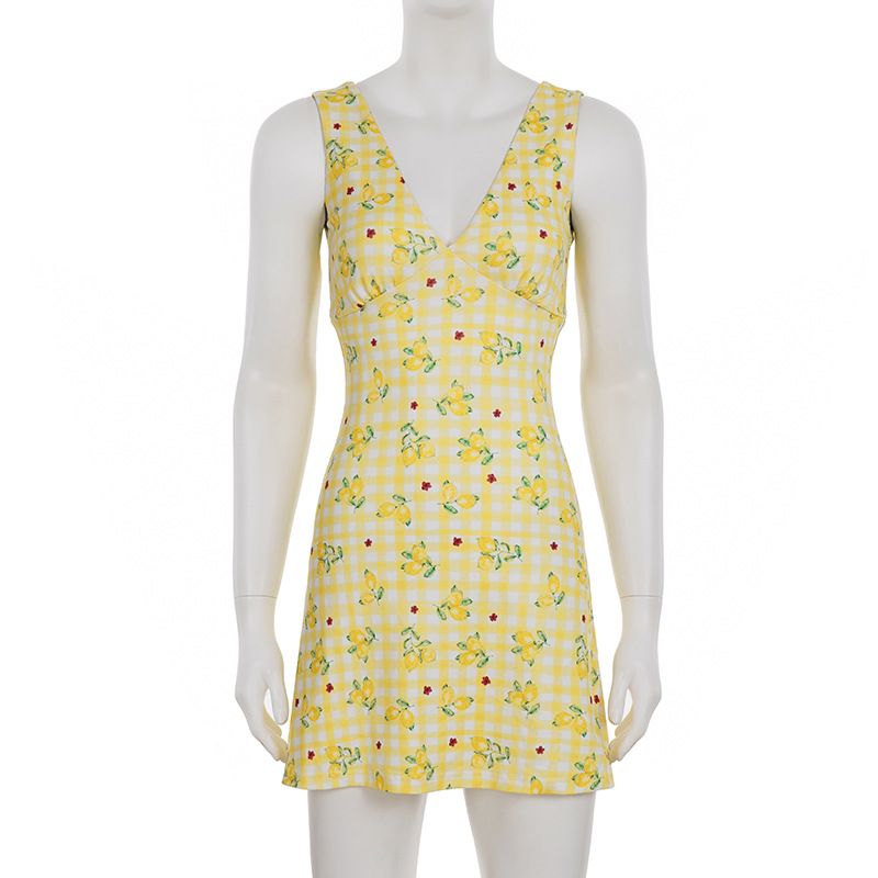 Summer Women Lemon Yellow Small Floral Print V neck Sexy Tight Waist A line Short Dress Sleeveless Dress