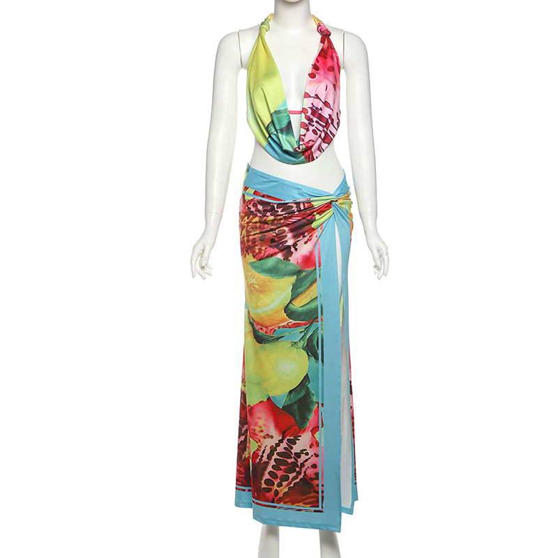 Summer Women Sexy Halter Backless Top Split Skirt Two Piece Sets