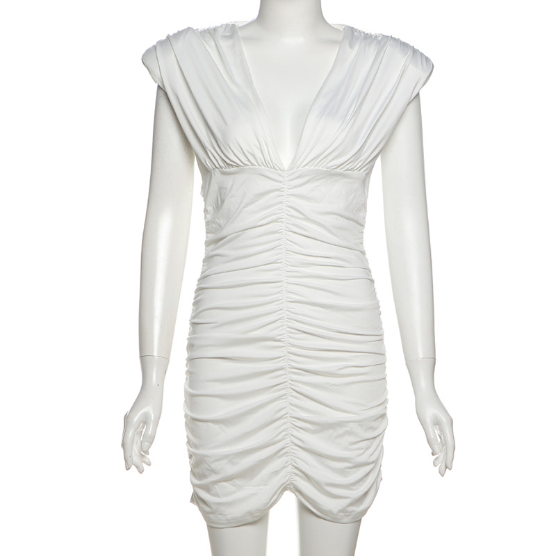 Summer Women Sexy V neck Hip Pleated Solid Color Slim Fit Dress