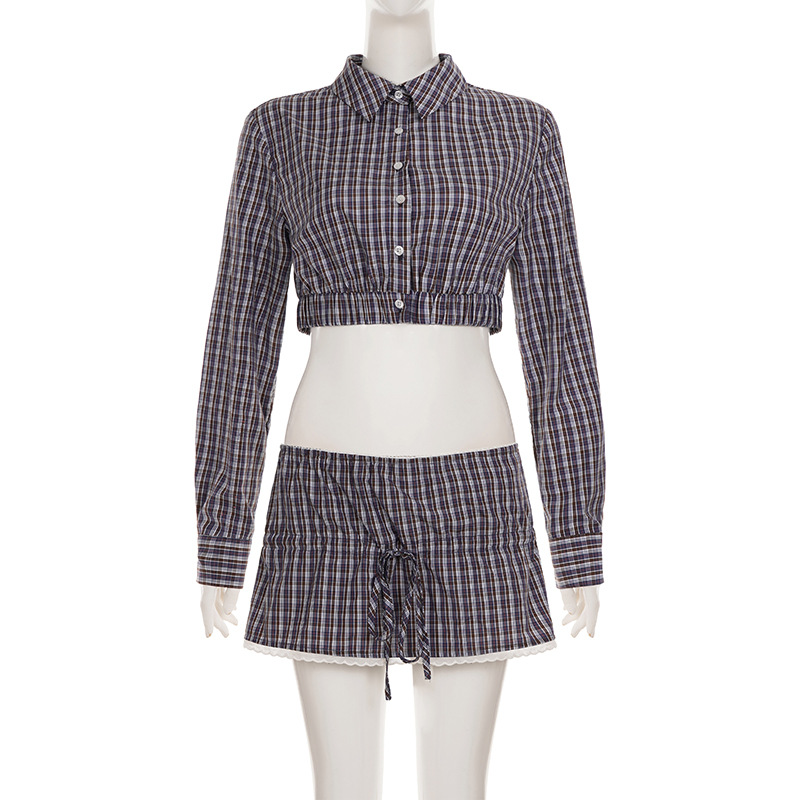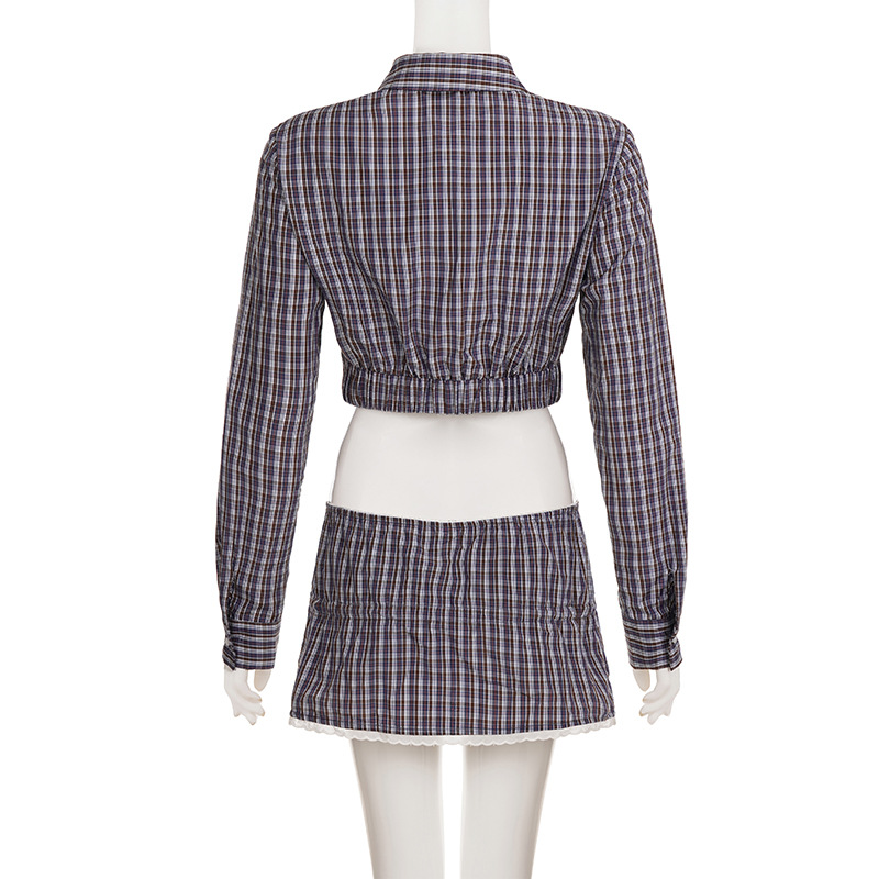 Sweet Spicy Girl Plaid Breasted Long Sleeve Short Shirt Women Autumn Slimming Skirt Short Skirt Two Piece Set