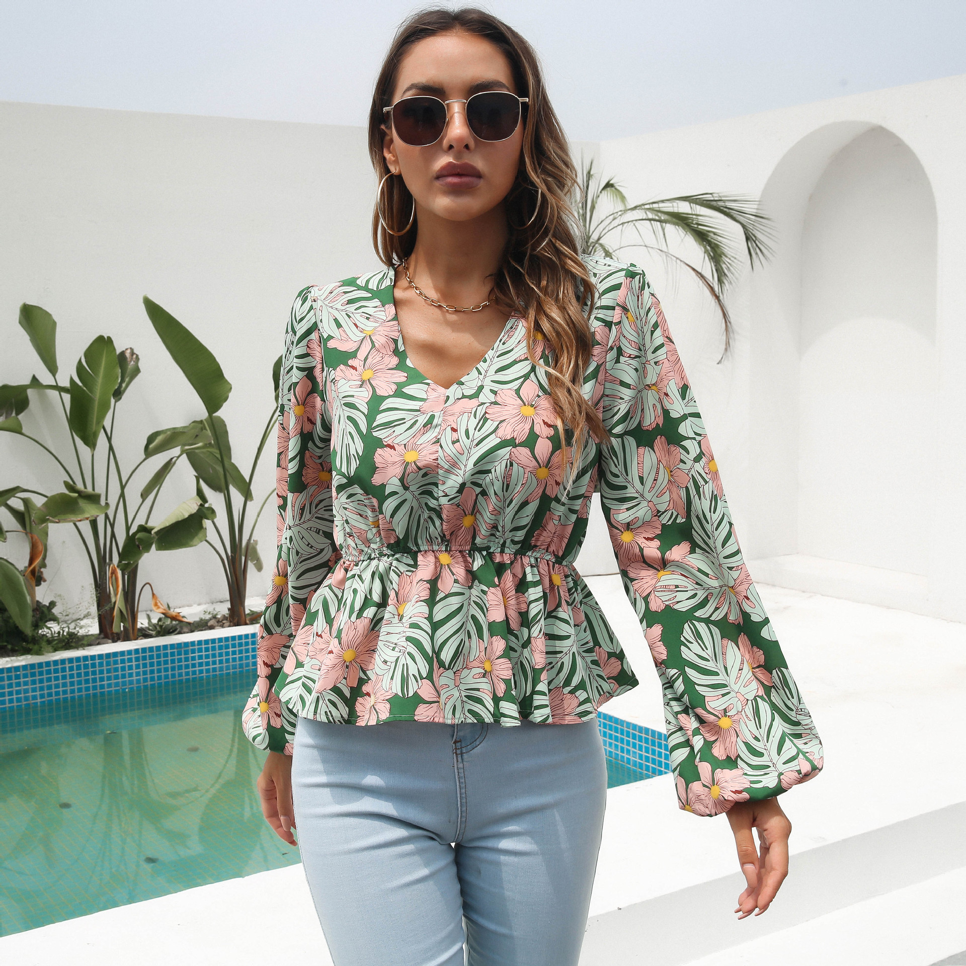 V Neck Cinched Plaid Floral Print Lantern Sleeve Chiffon Shirt Women Shirt Spring Autumn Women Clothing