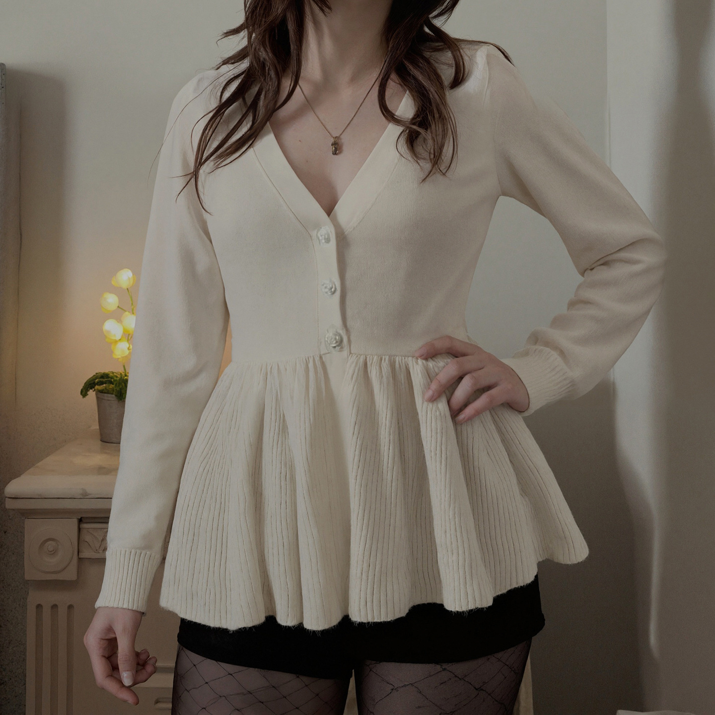V neck Rose Buckle Solid Color Woolen Cardigan Women Ball Waist Slimming a Swing Top