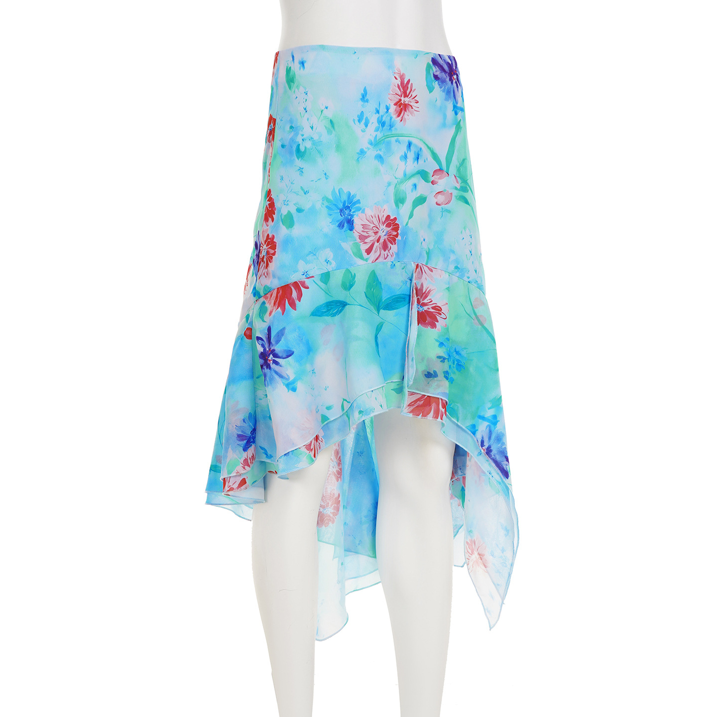 Vacation Floral Color Skirt Women Summer Irregular Asymmetric Design Oil Painting Mesh Midi Skirt