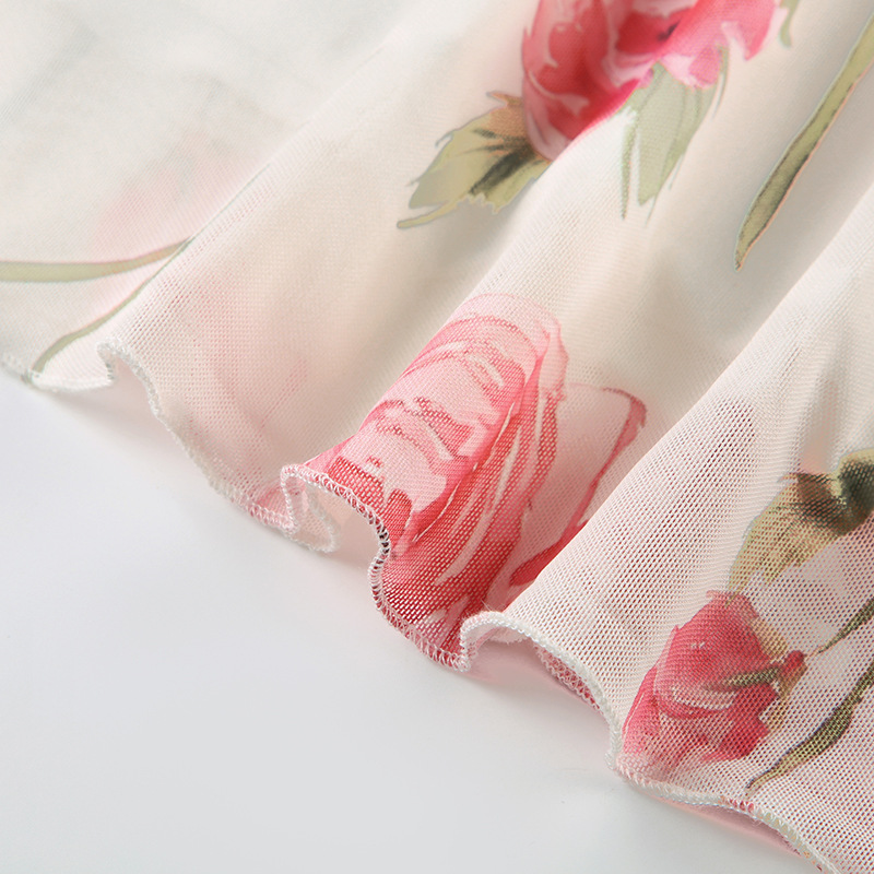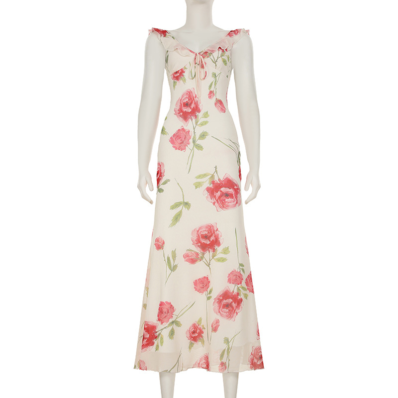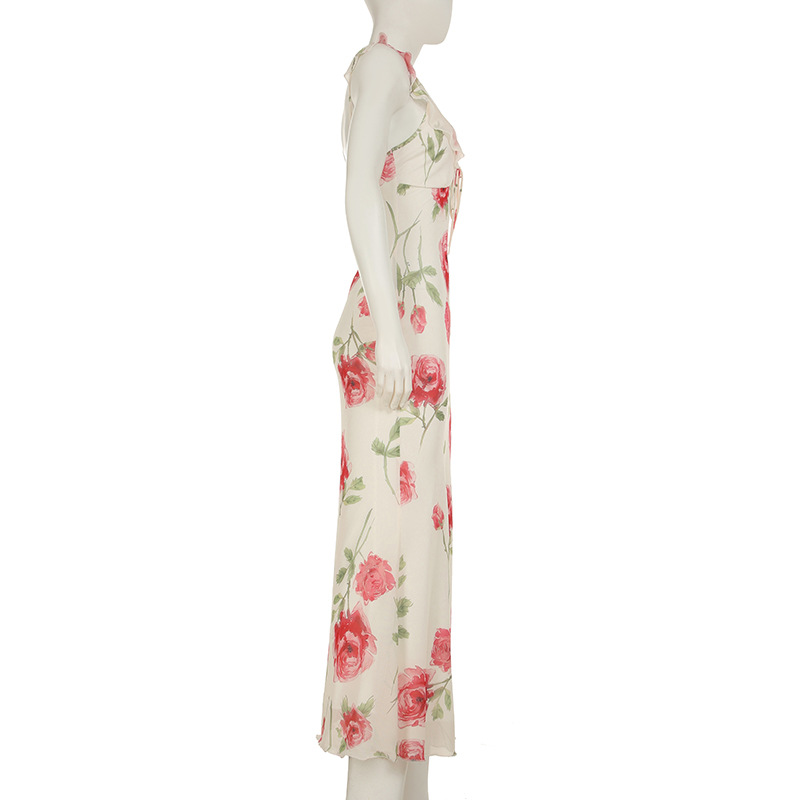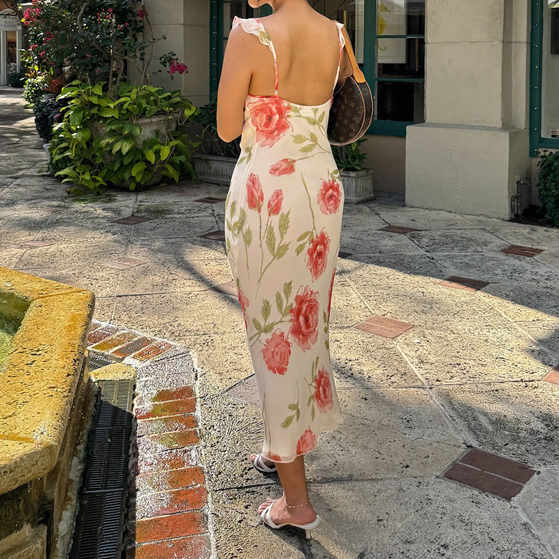 Vacation Floral Printed Mesh V neck Sexy Dress Summer Sling Slim Fit Maxi Dress