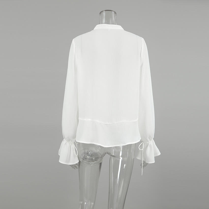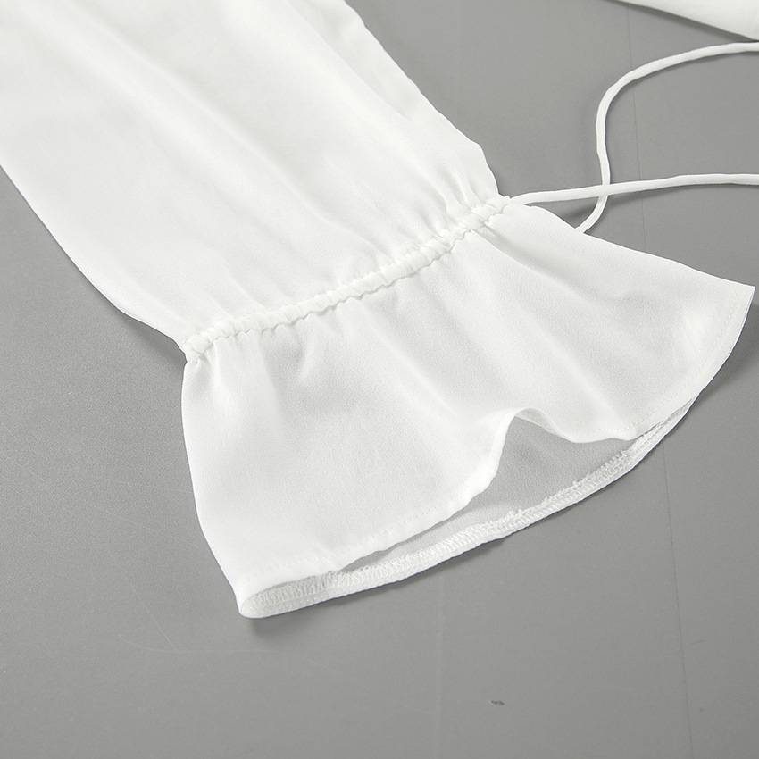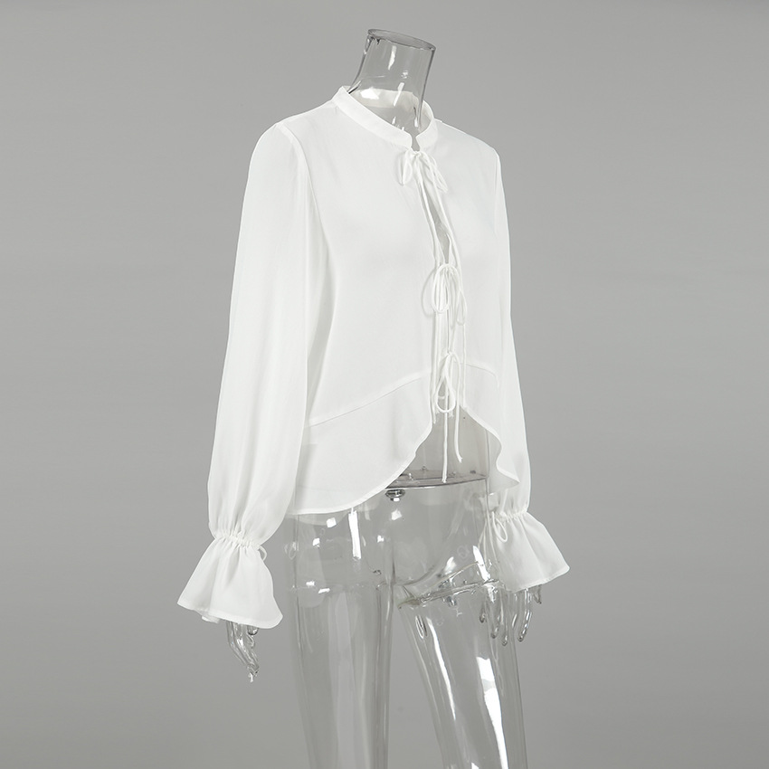 White Chiffon Small Stand Collar Design Drawstring Women Shirt Autumn Winter Top