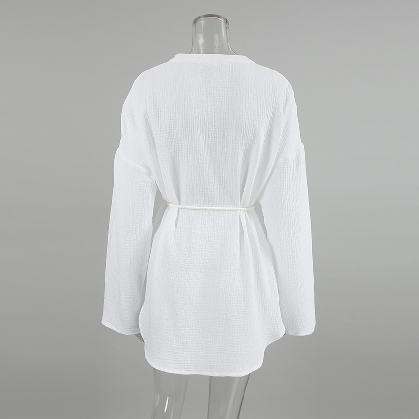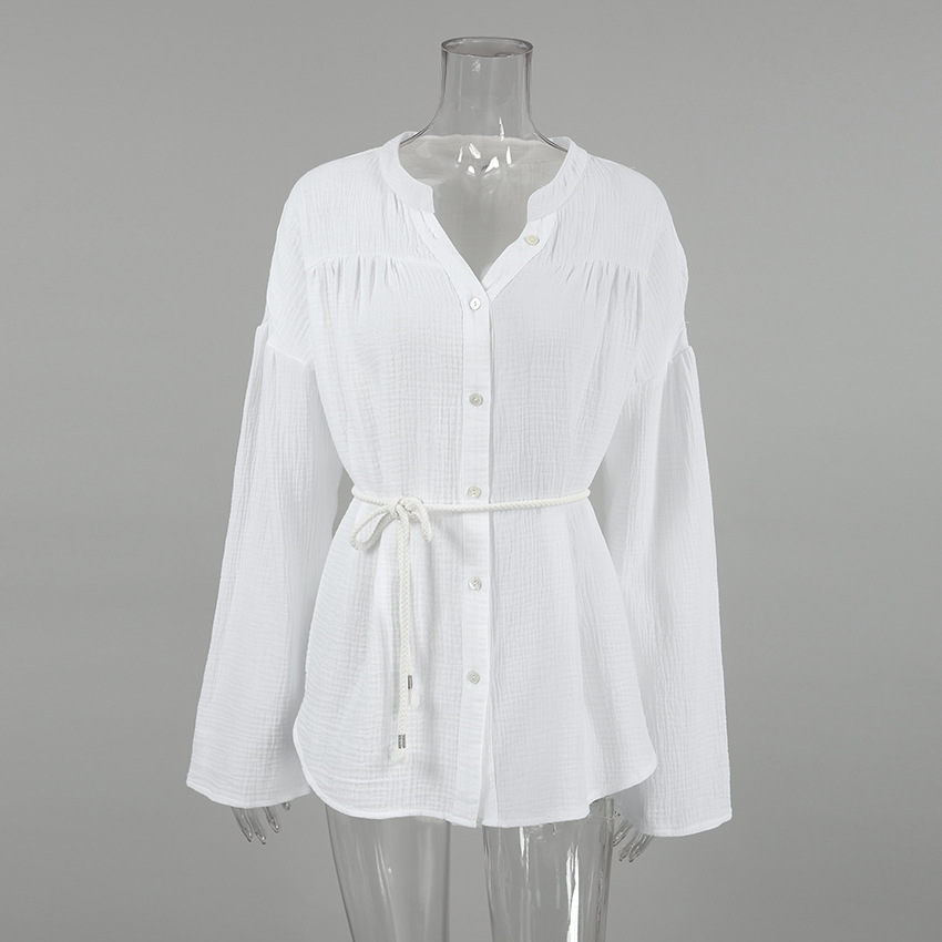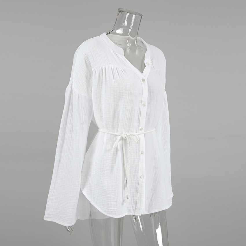 White Cotton Bubble Crepe Small Stand up Collar Tie Long Sleeved Shirt Women Top