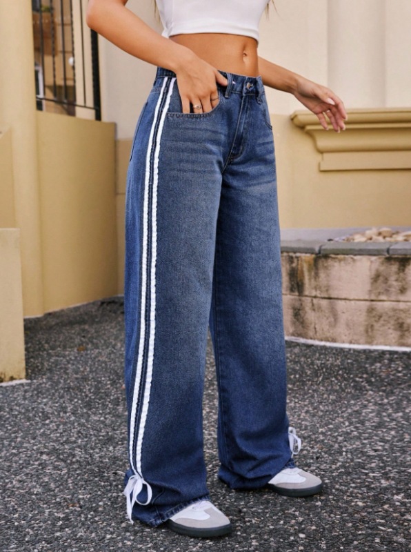 Wide Leg Blue Jeans White Striped Bow Pattern Domestic First Second Line Brand