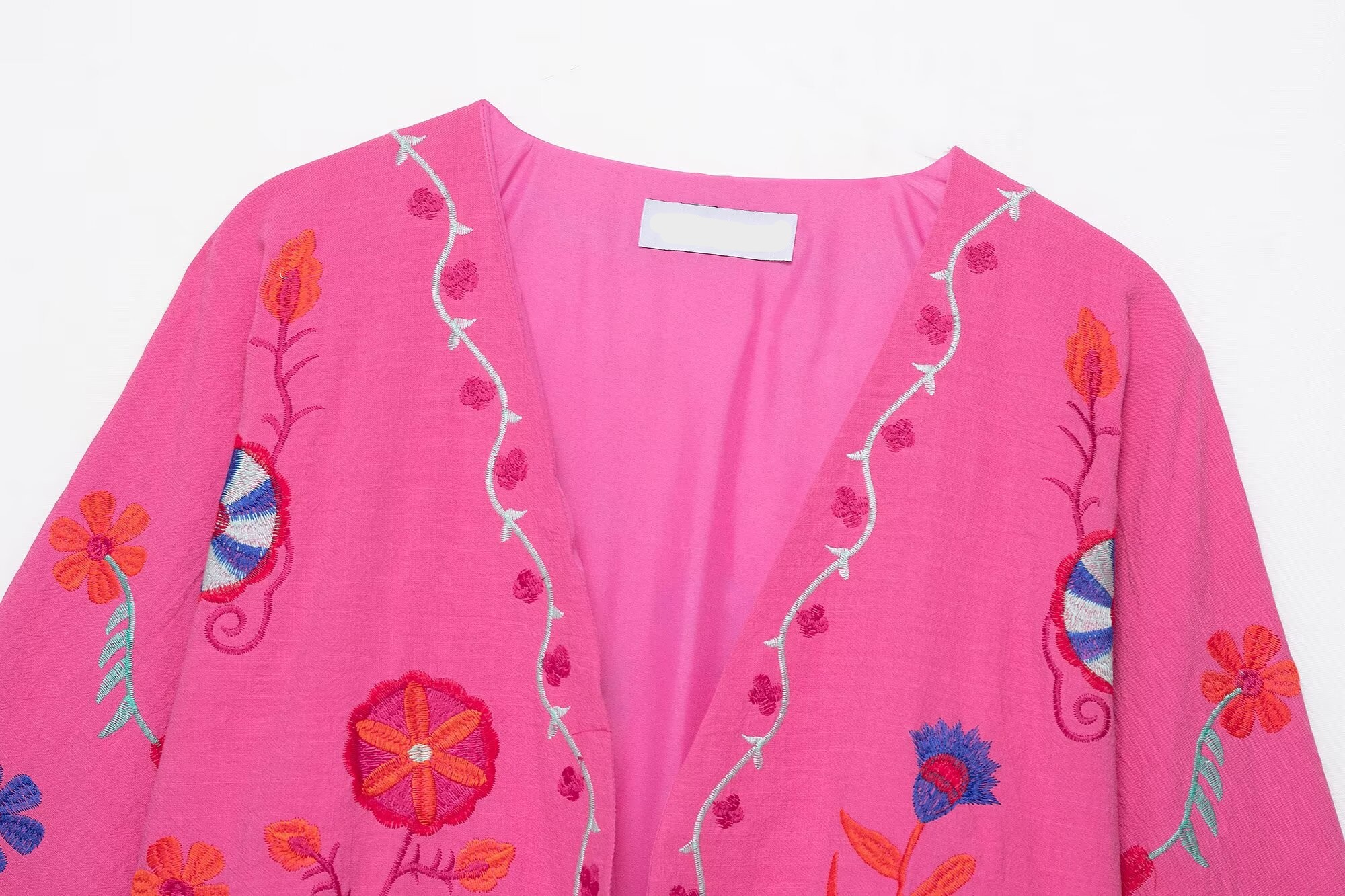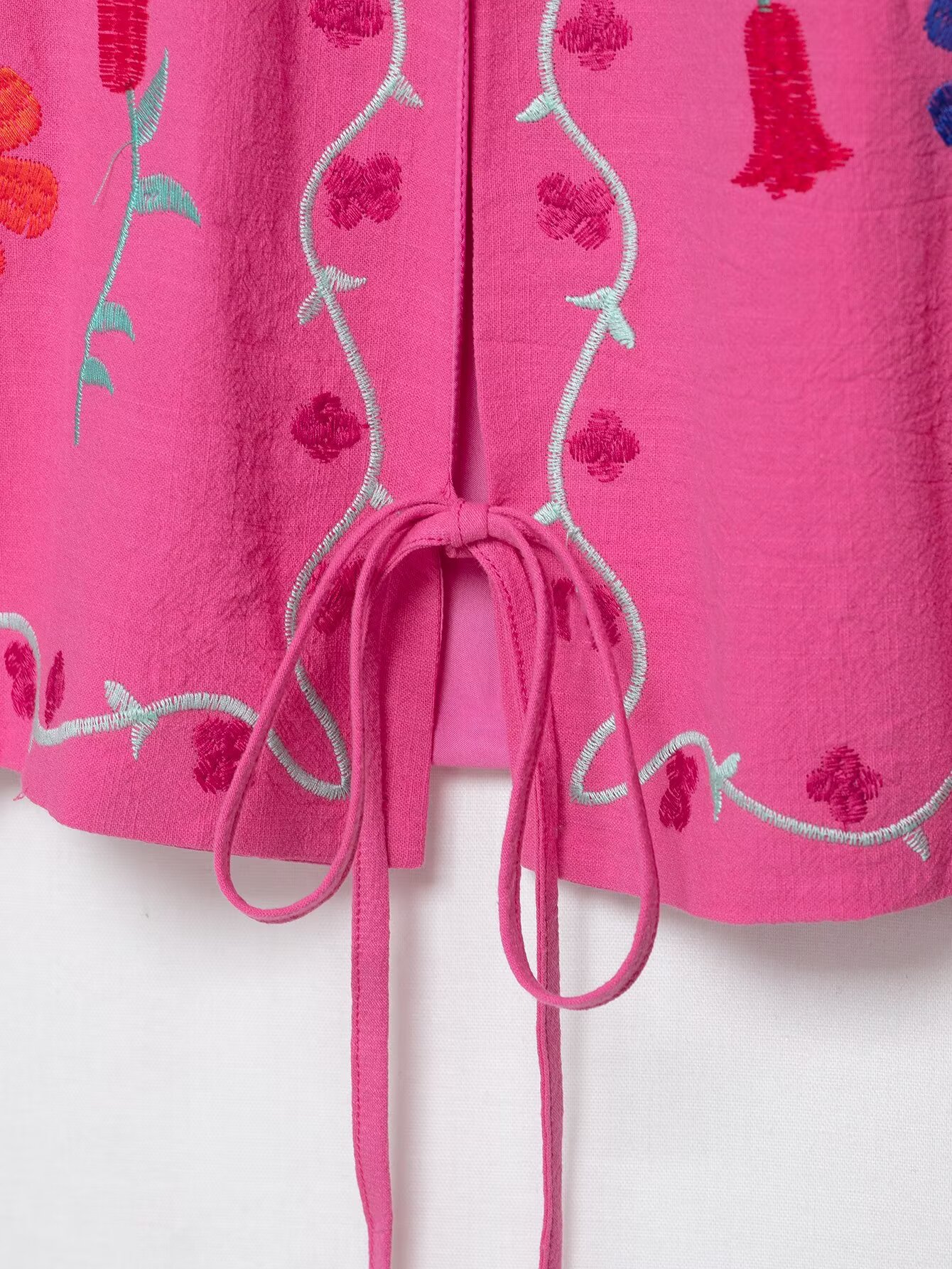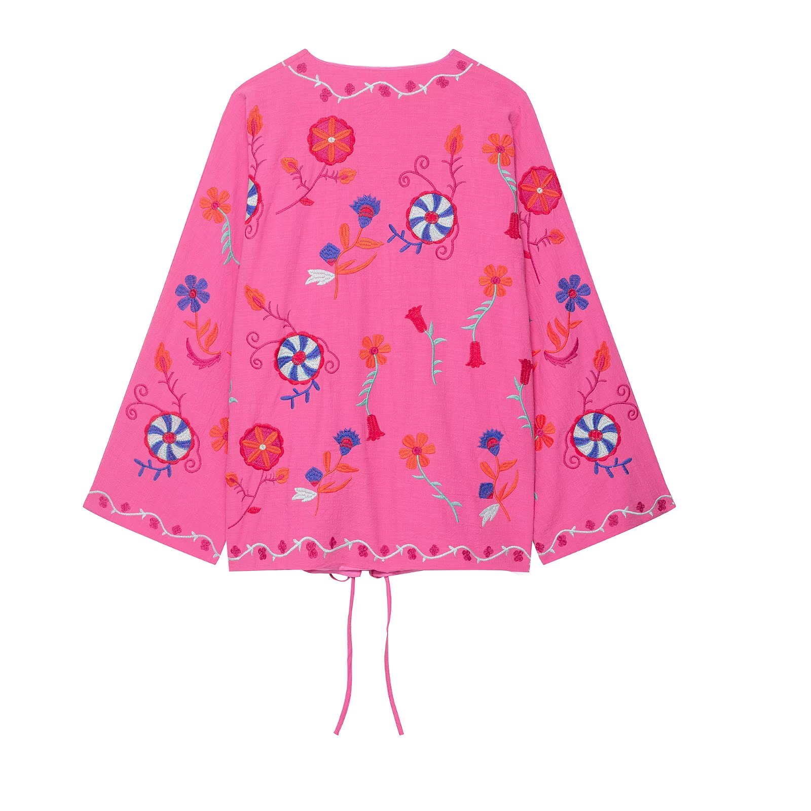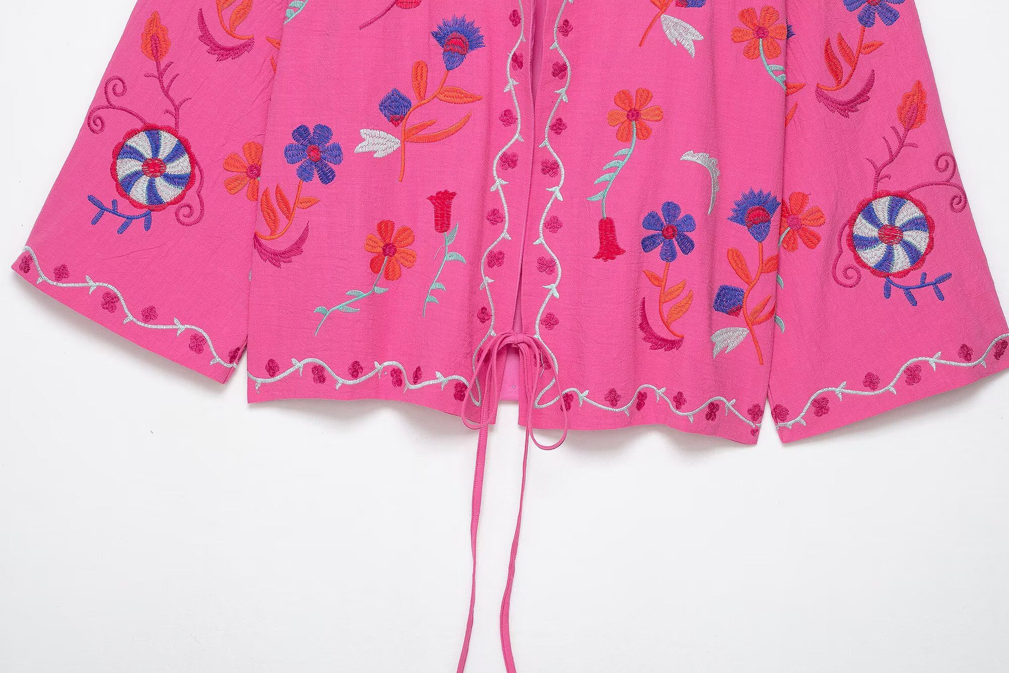 Women Clothing Autumn Loose Embroidered Cardigan Tie Front Top