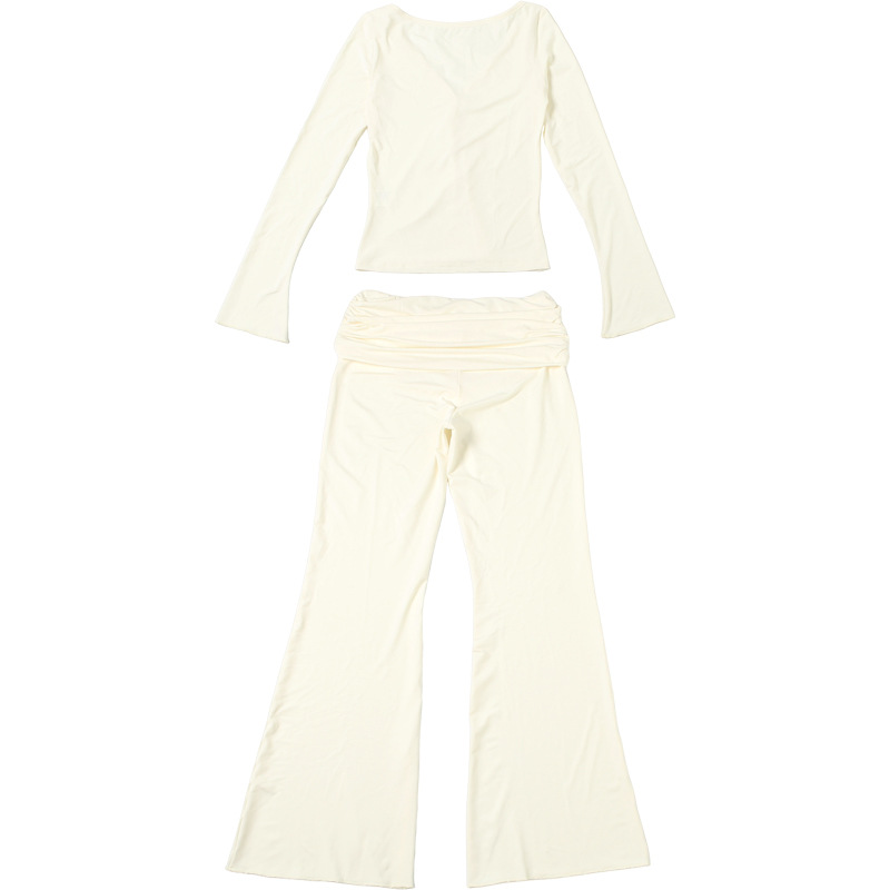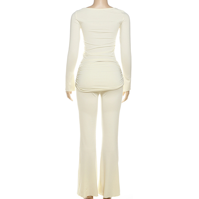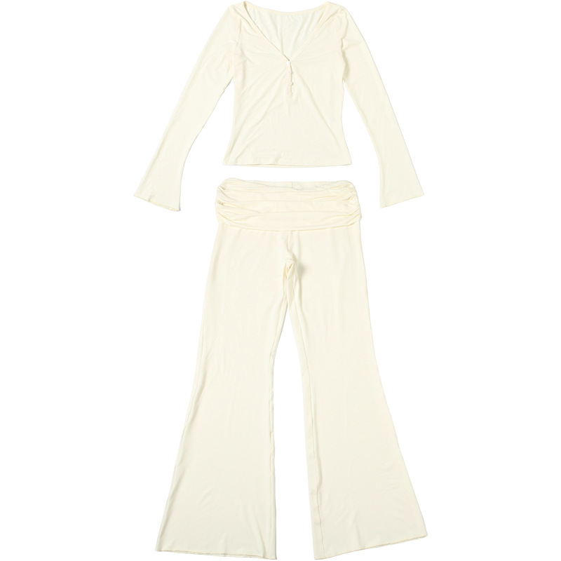 Women Clothing Autumn Solid Color Slim Fit V Neck Buttons Long Sleeve T shirt High Waist Bootcut Pants Set Women