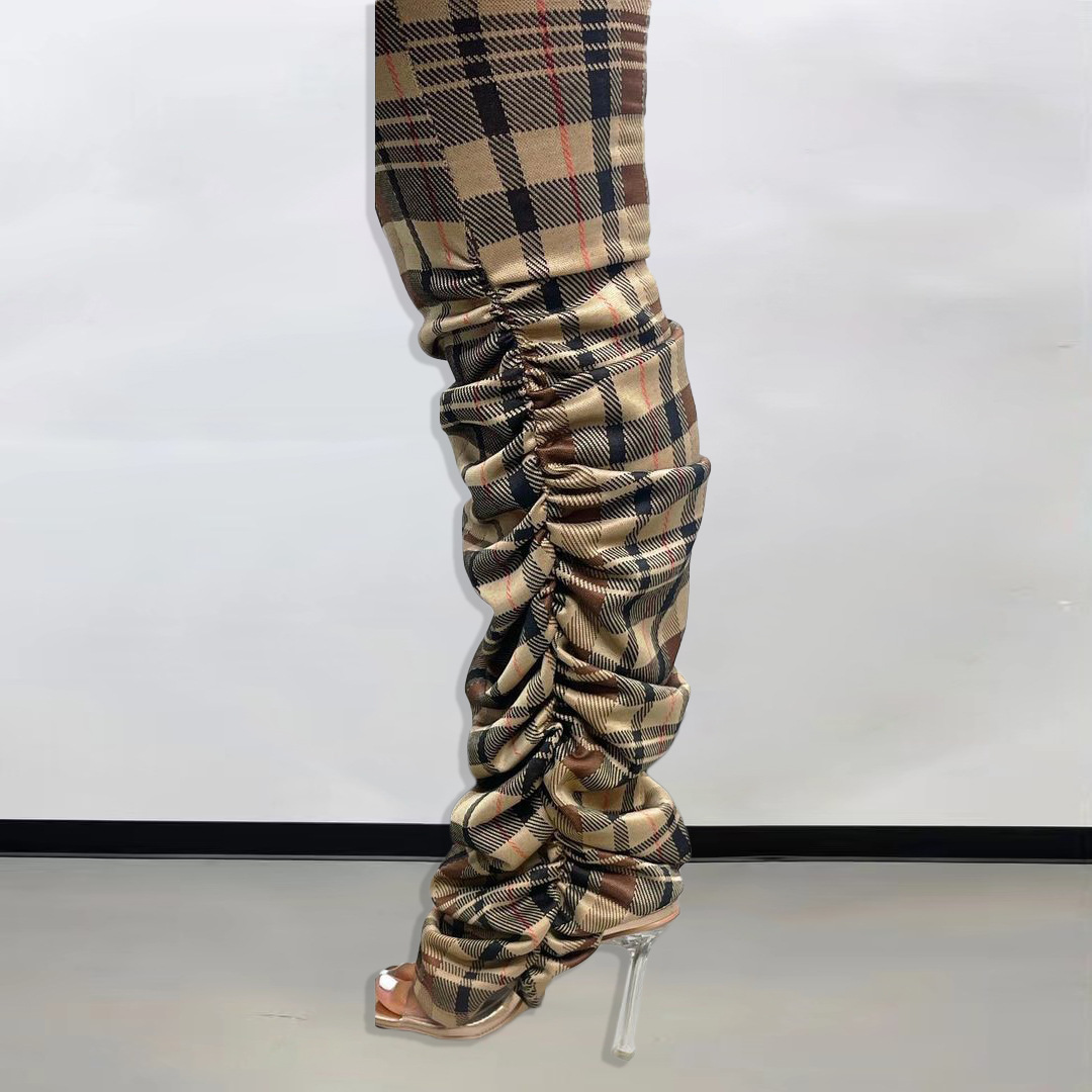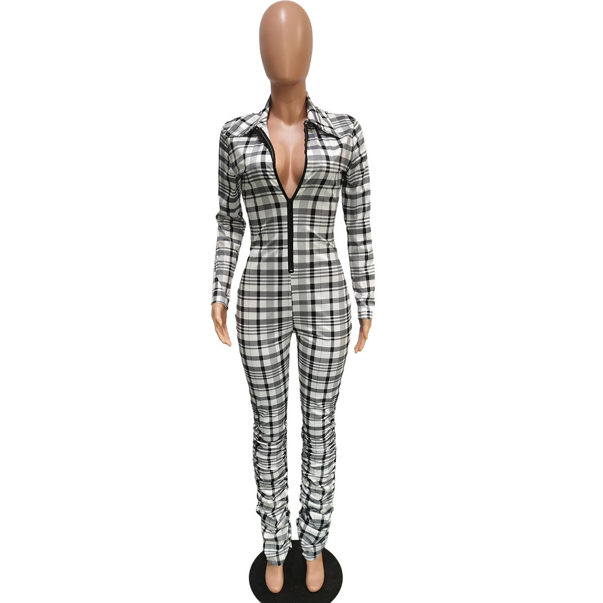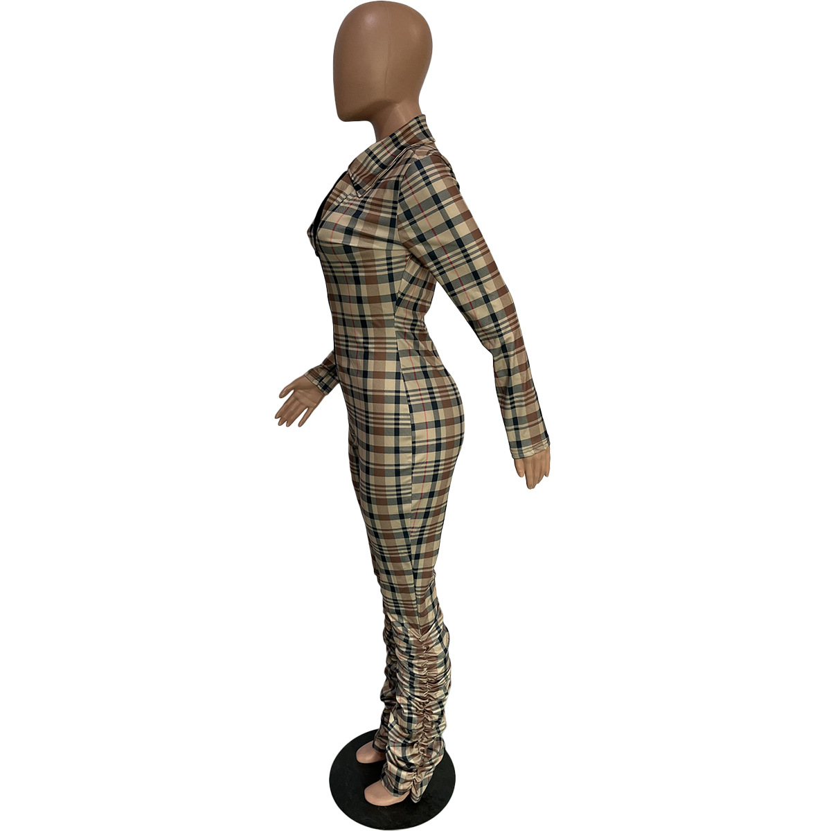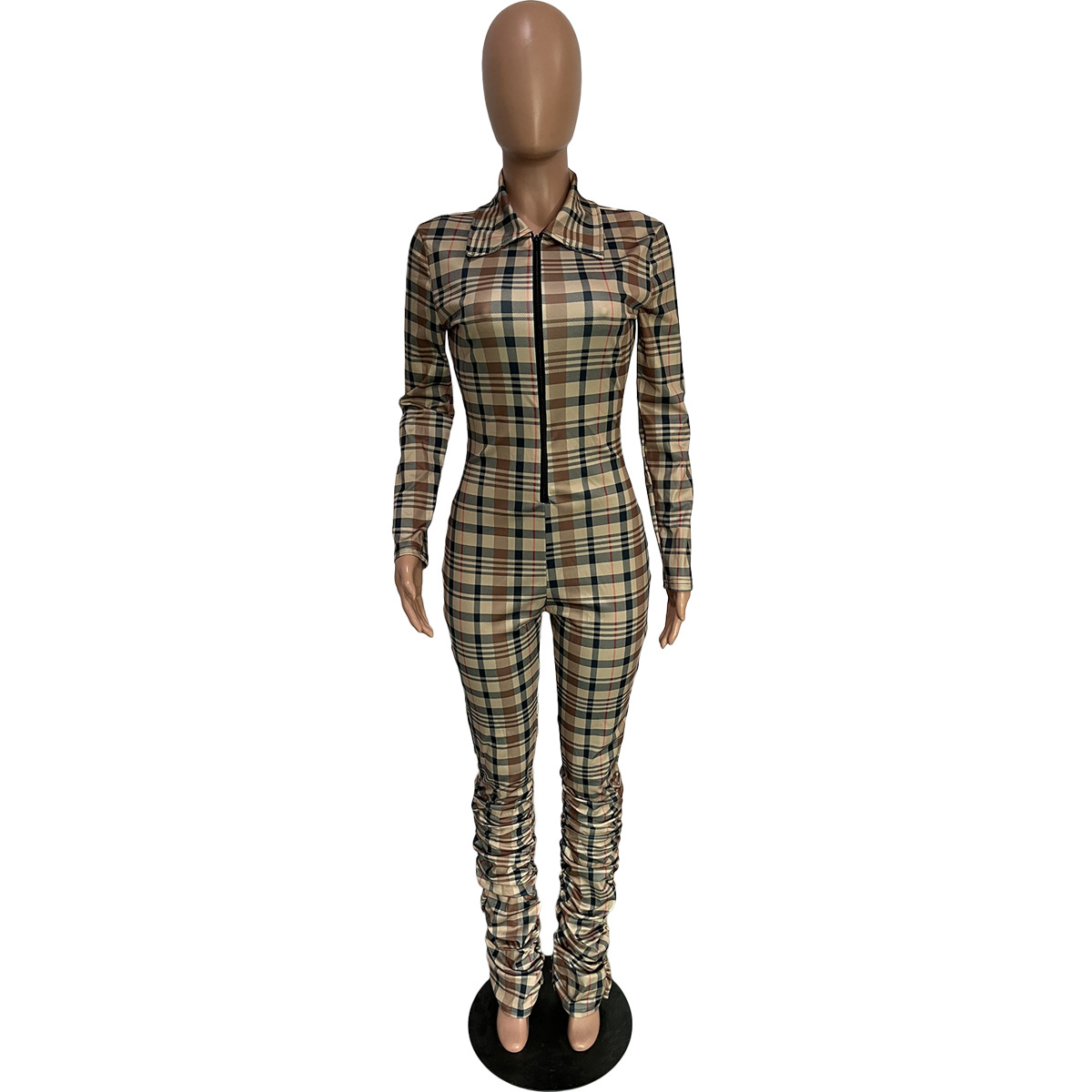 Women Clothing Autumn Winter Printed Checks Collared Slim Pleated Zipper Jumpsuit