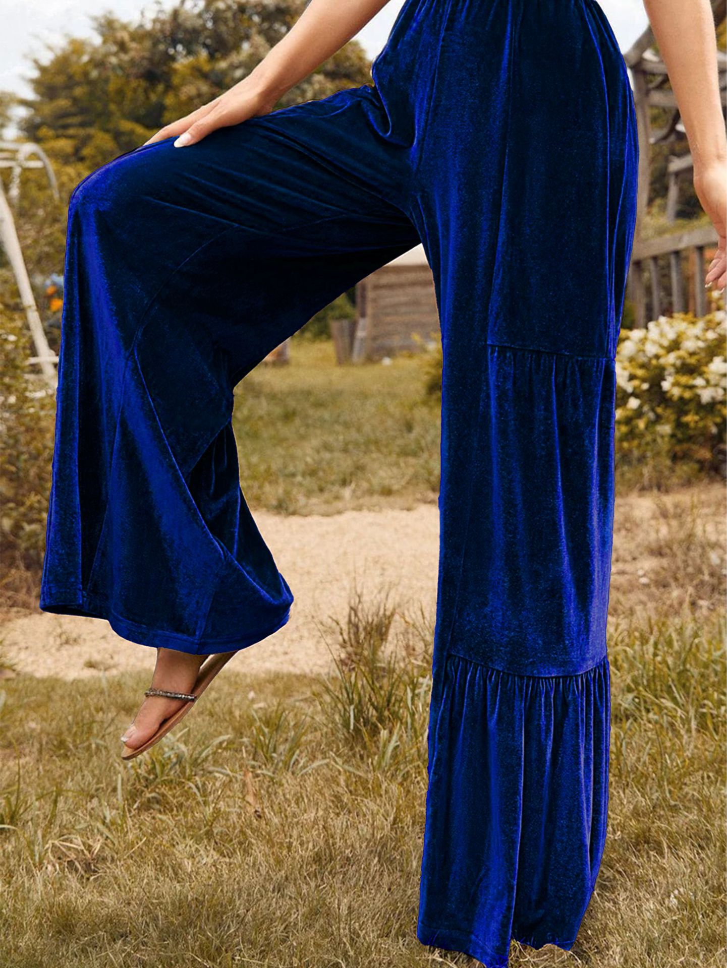 Women Clothing Autumn Winter Trendy Casual Trousers Gold Velvet Ruffled Wide Leg Pants