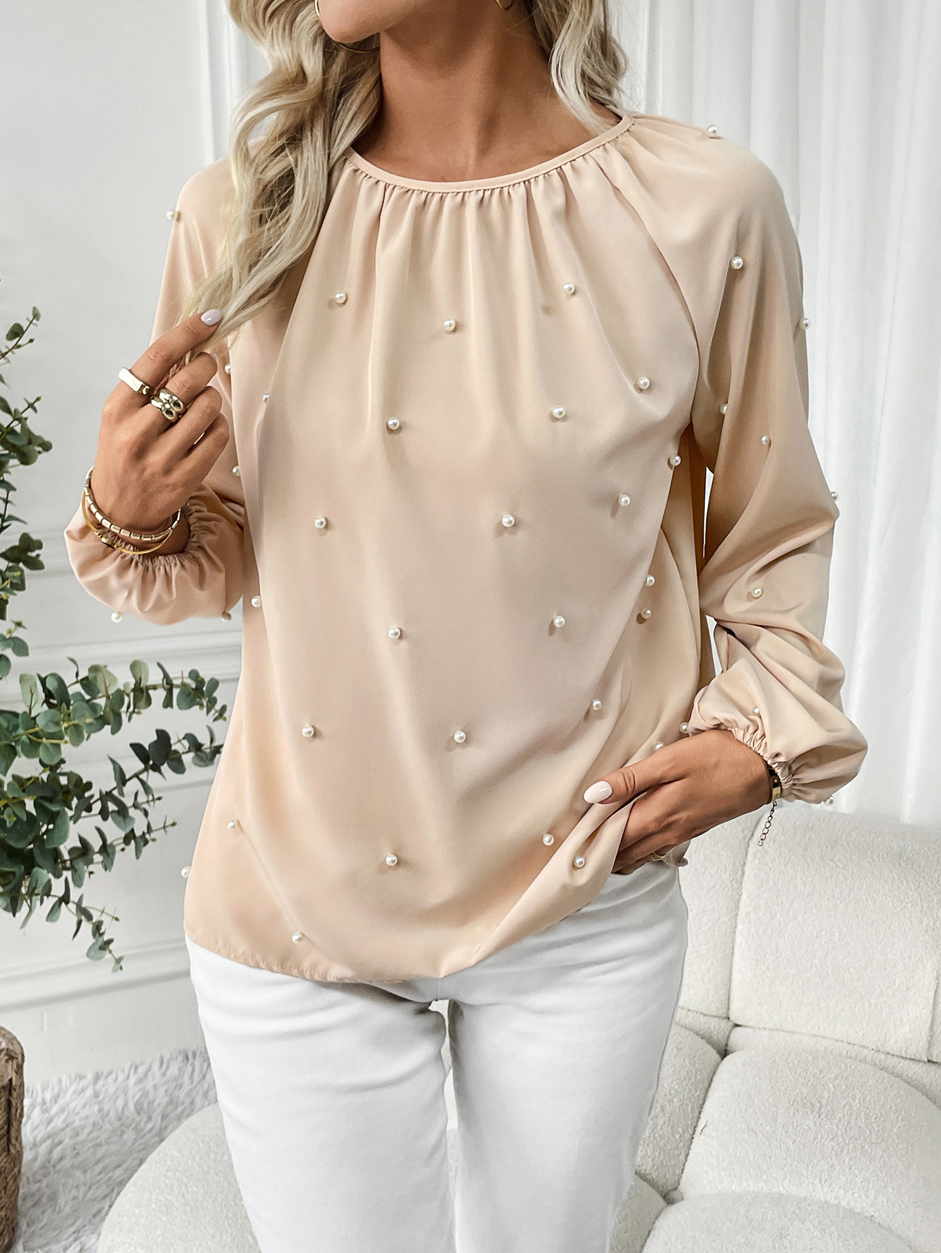 Women Clothing Best Seller Spring Autumn round Neck Beaded Lantern Sleeve Shirt