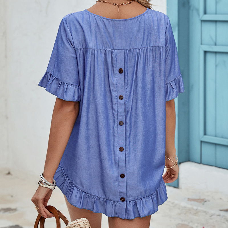 Women Clothing Casual Solid Color Round Neck Ruffled Short Sleeves Shirt Women