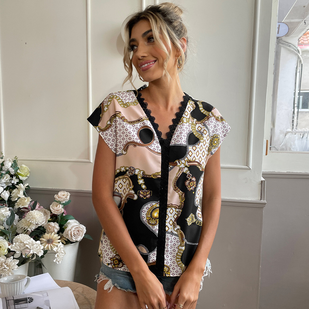 Women Clothing Popular Short Sleeve Striped V neck Shirt Blouse