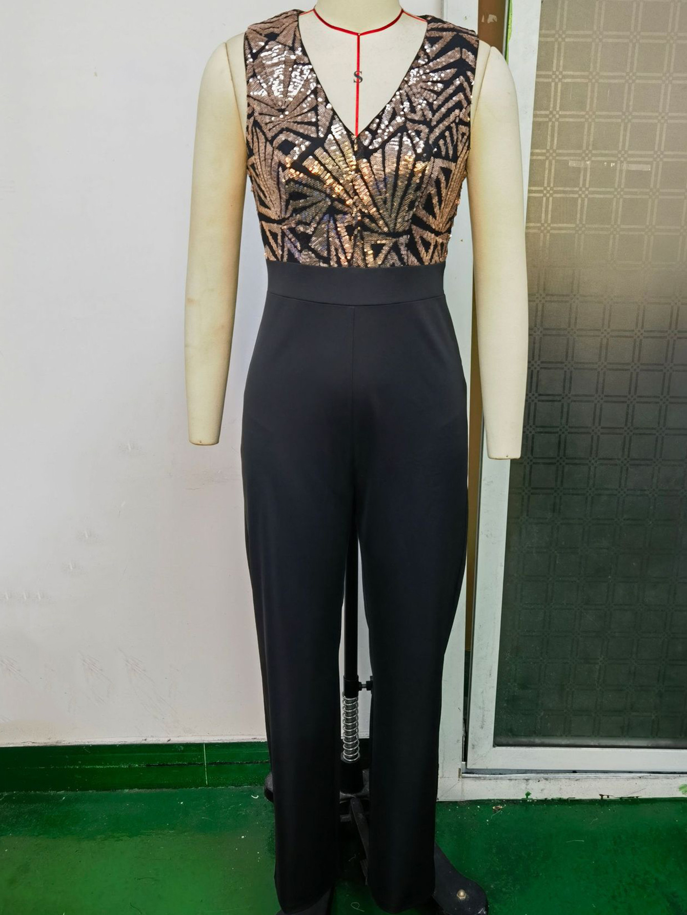 Women Clothing Sexy Retro Black Backless Stitching Sequined Jumpsuit Trousers