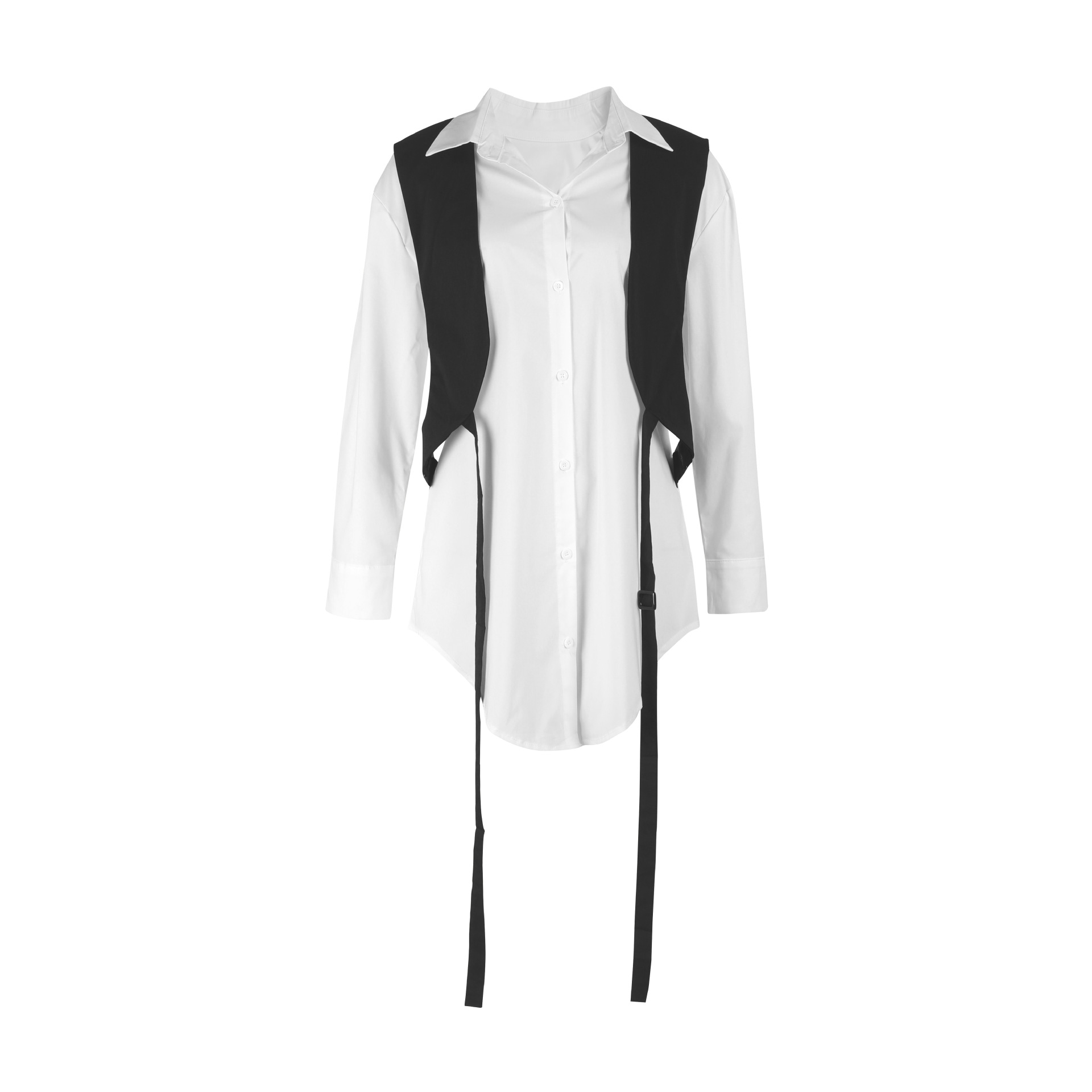 Women Clothing Shirt Dress Ribbon Waistcoat Faux Two Piece Long Sleeve Shirt Autumn