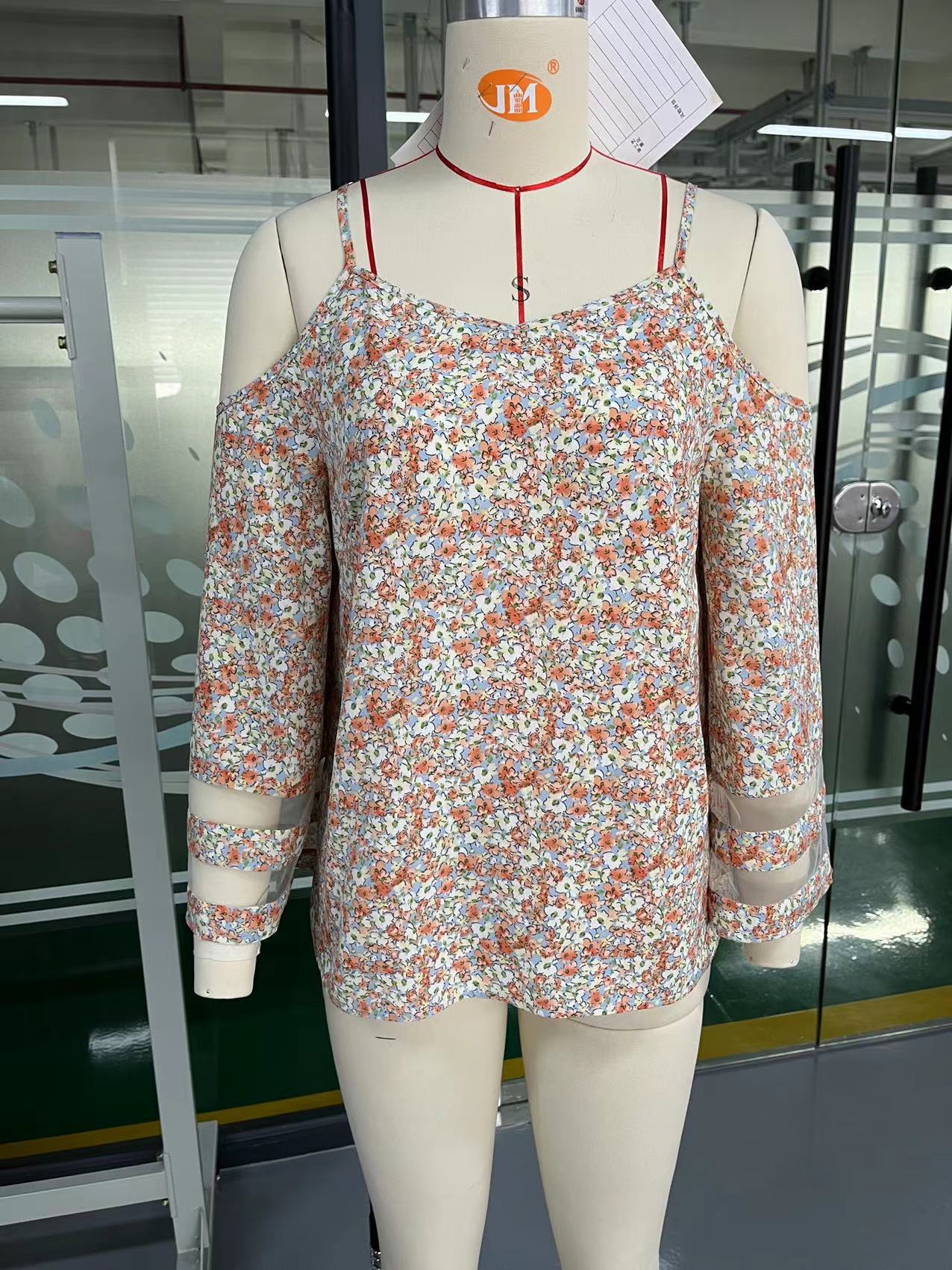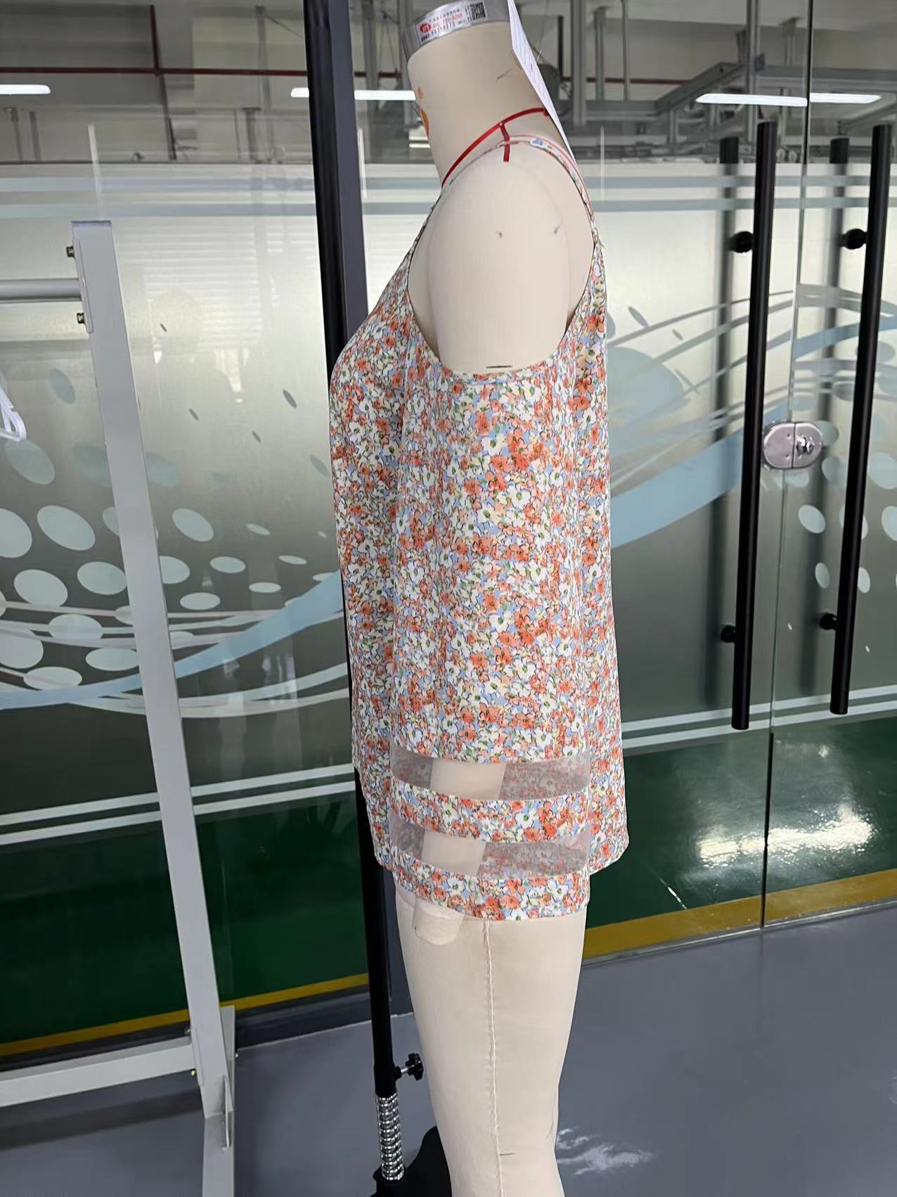 Women Clothing Sling Shirt Loose off Shoulder Printed T shirt Lotus Leaf Sleeve Stitching Mesh Top