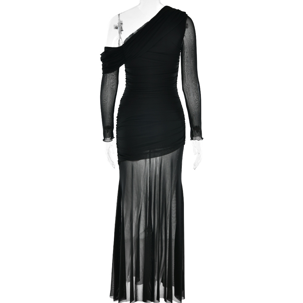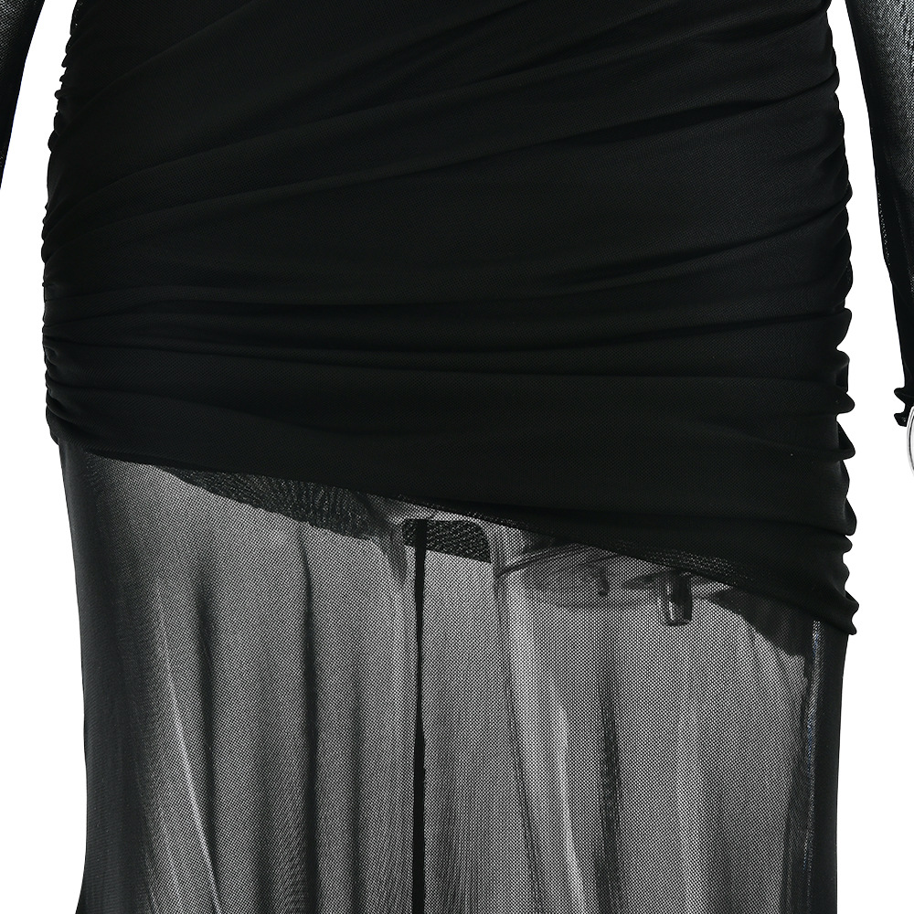 Women Dress Mesh Stitching Pleated Solid Color Long Sleeve Slim Fit Maxi Dress