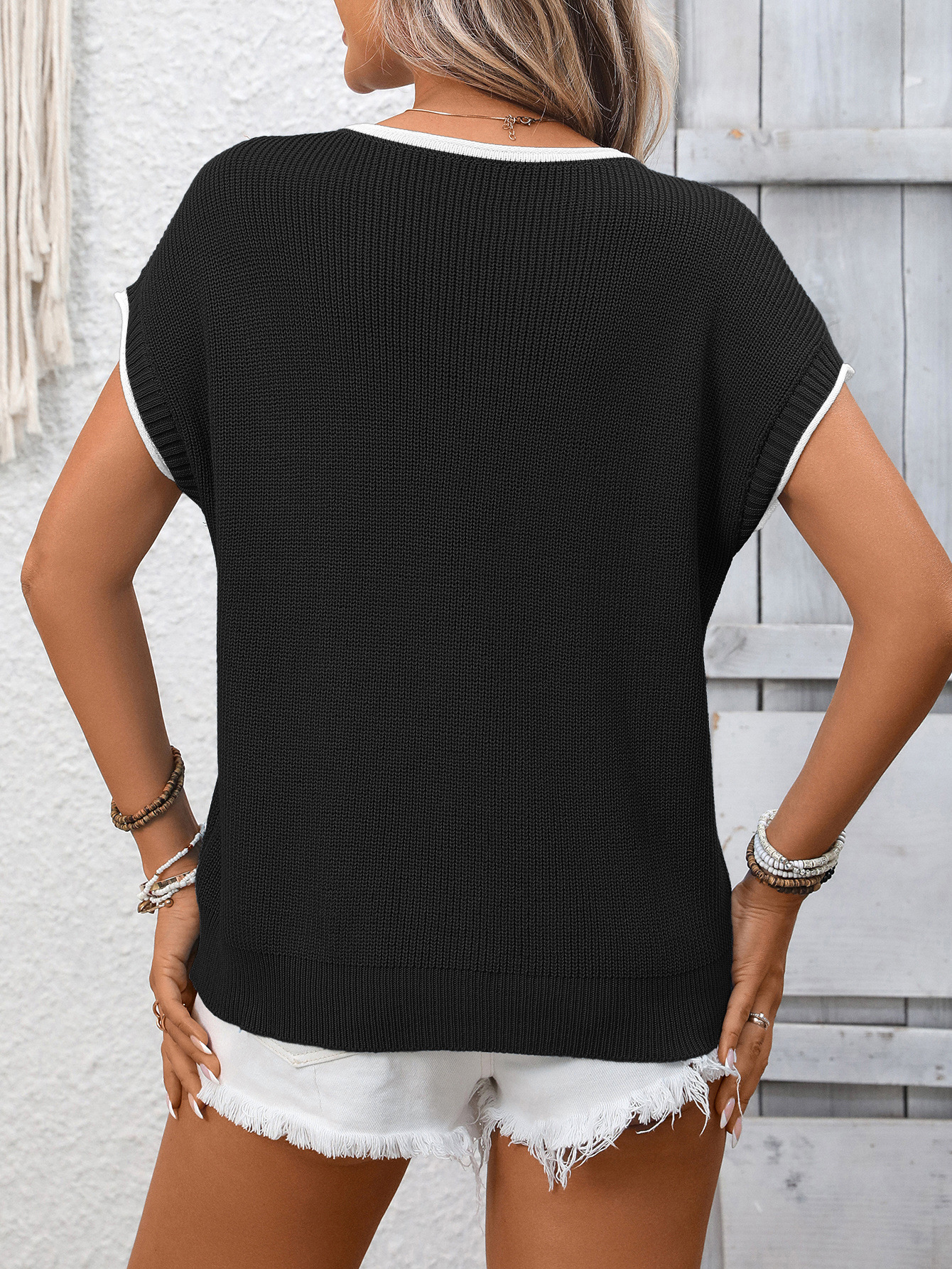 Women Round Neck Collar with Contrast Color Top Sweater with Short Sleeves