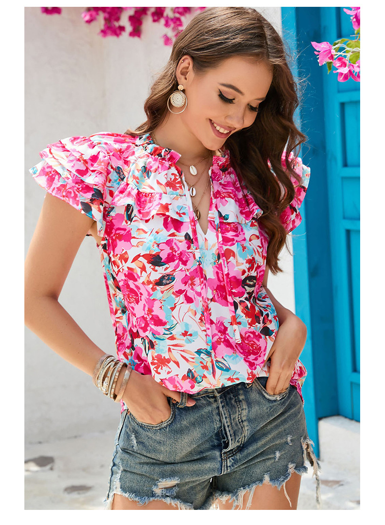 Women Summer Floral Print Chiffon Ruffle Sleeve Elegant Simple Pullover