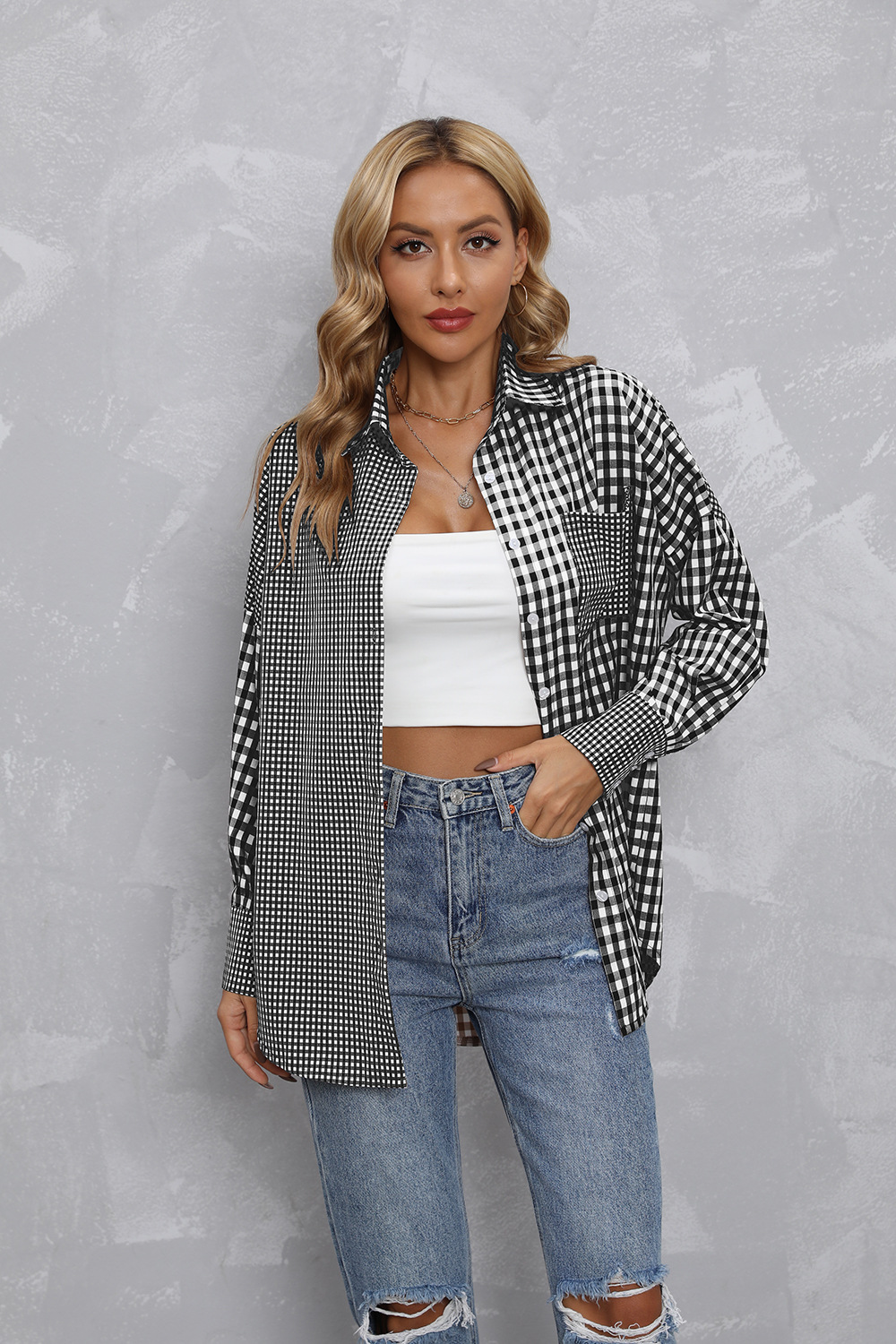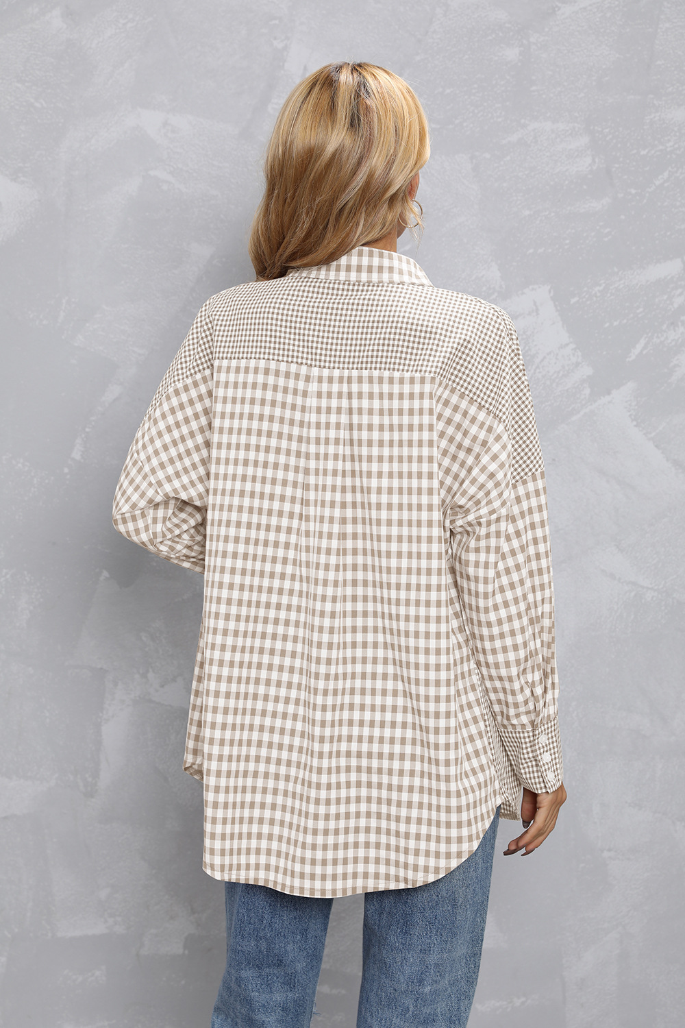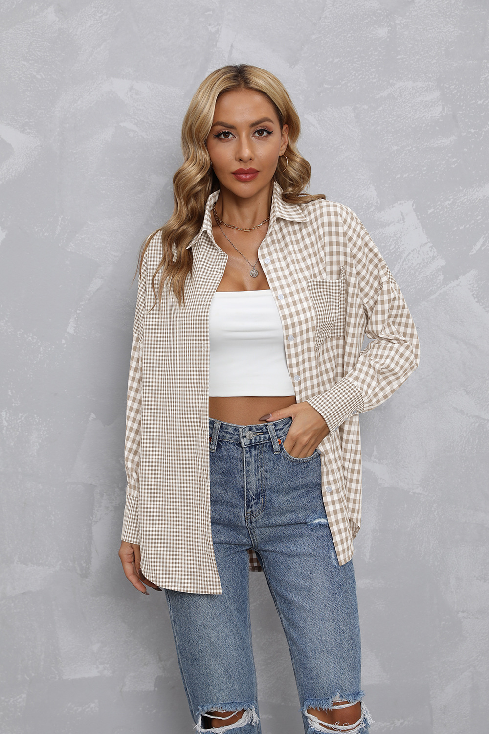 Women Top Autumn Collared Plaid Colorblock Loose Casual Shirt