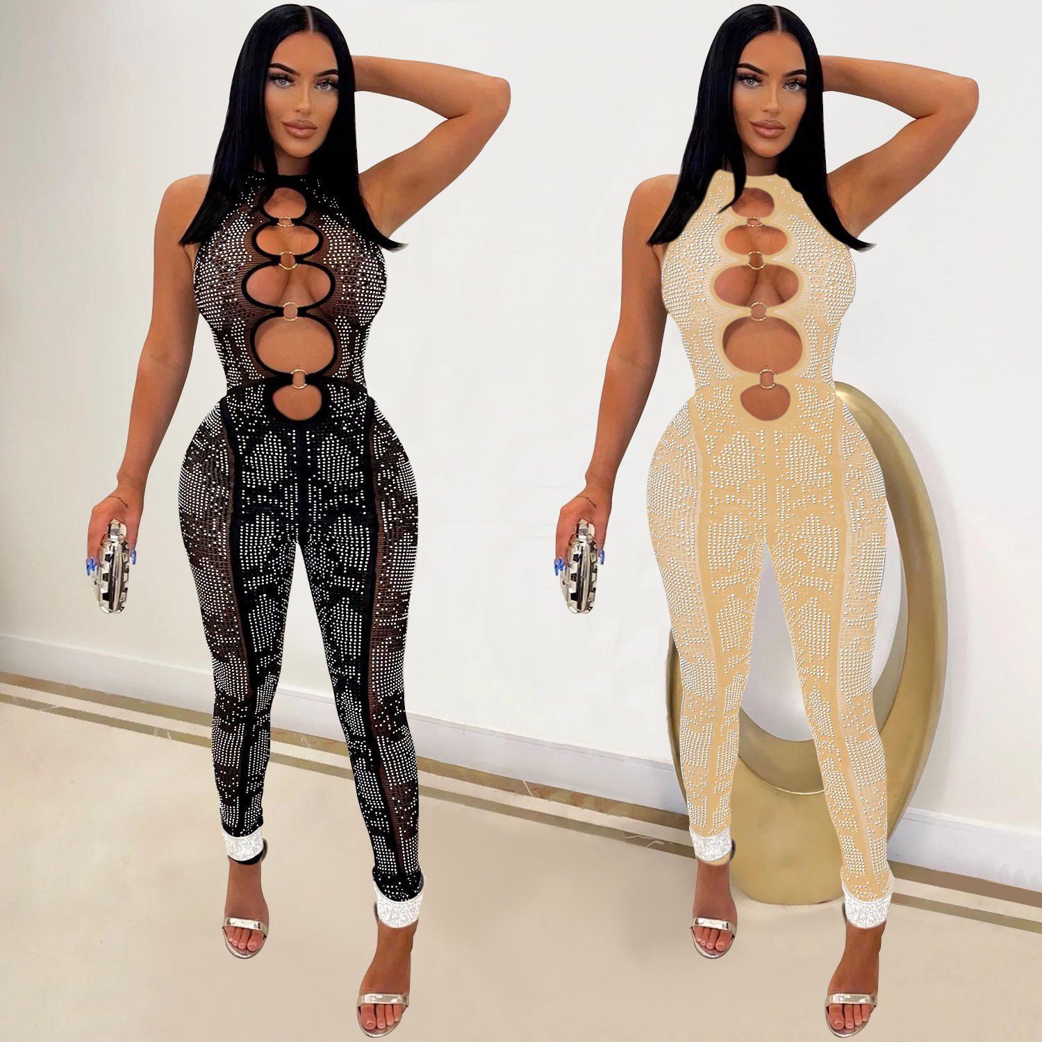 Women Wear Mesh See through Rhinestone Sleeveless Trousers Jumpsuit