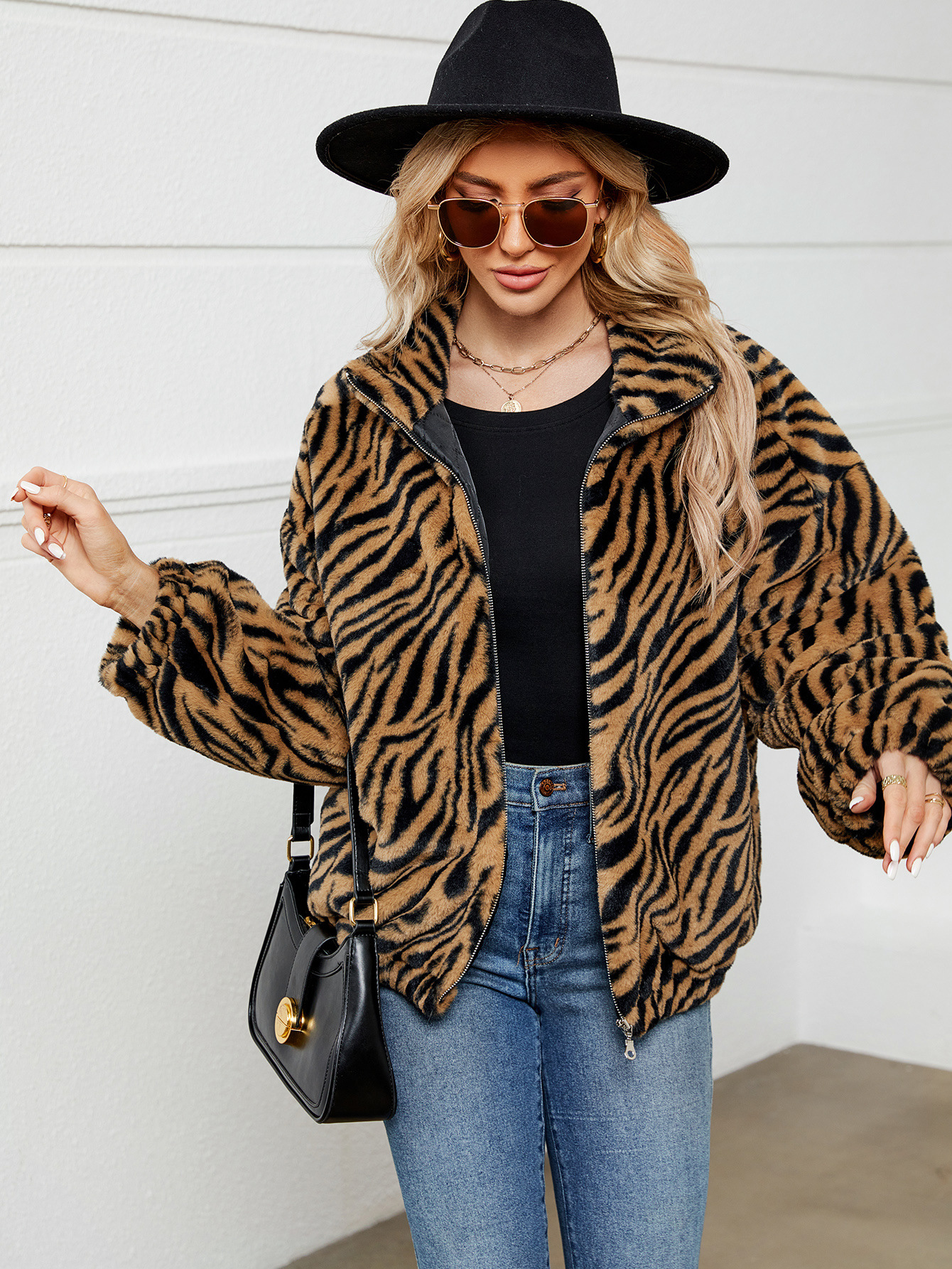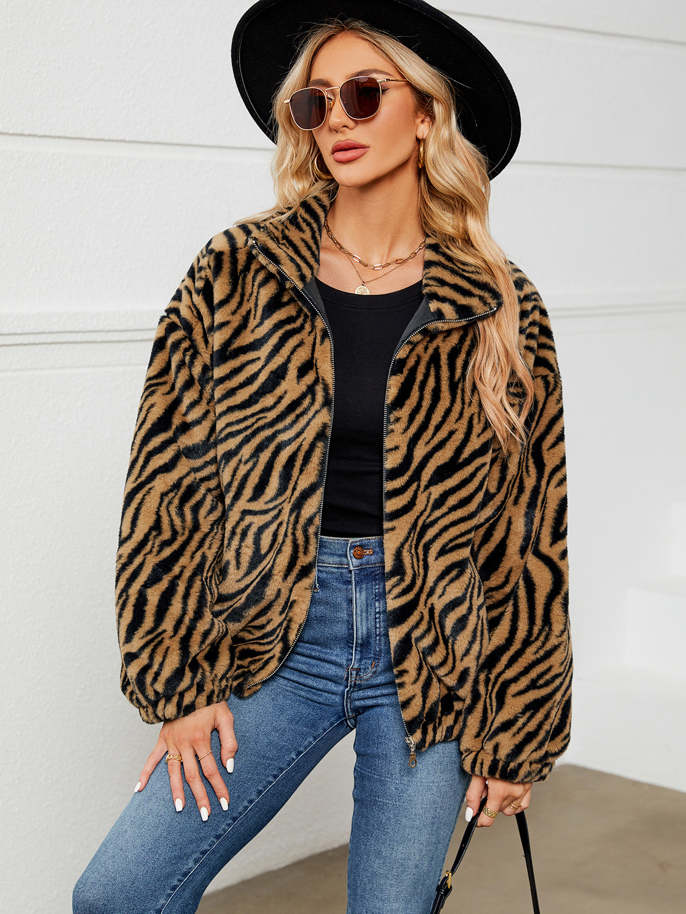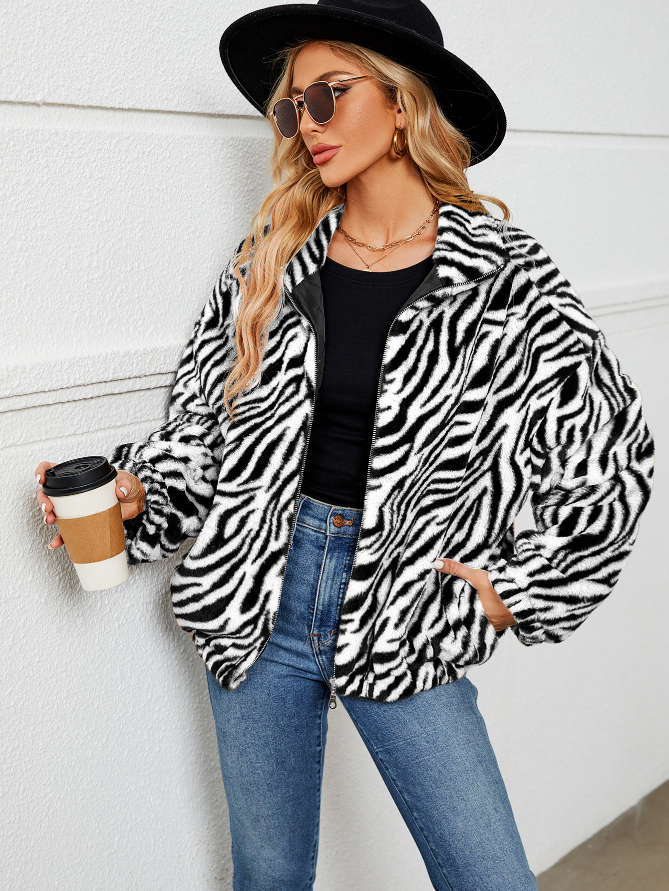 Zebra Pattern Plush Stand Collar Zipper Coat Faux Fur Coat Jacket