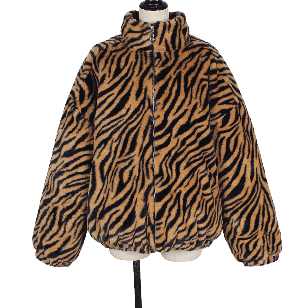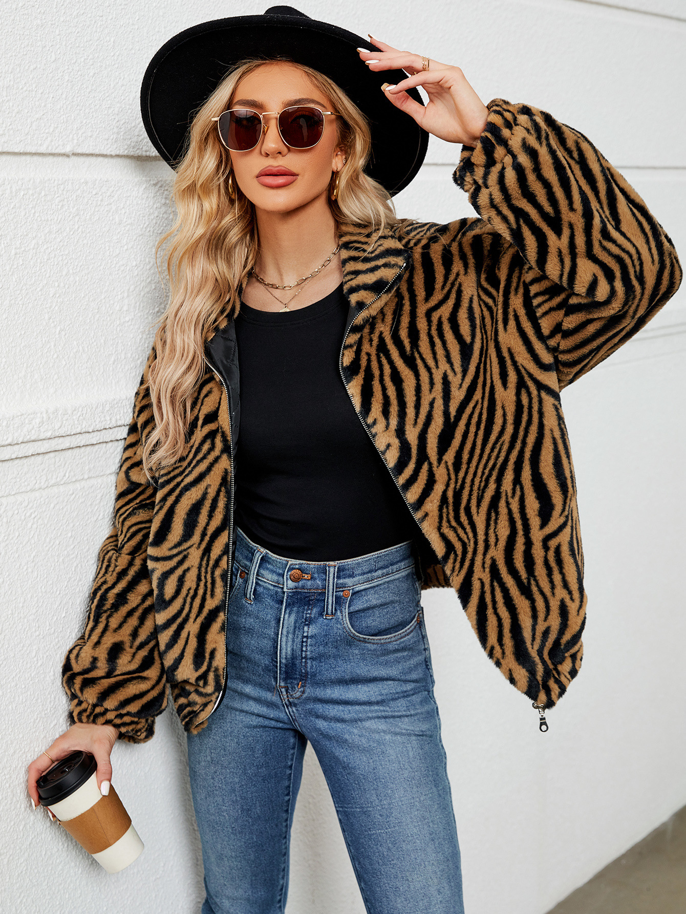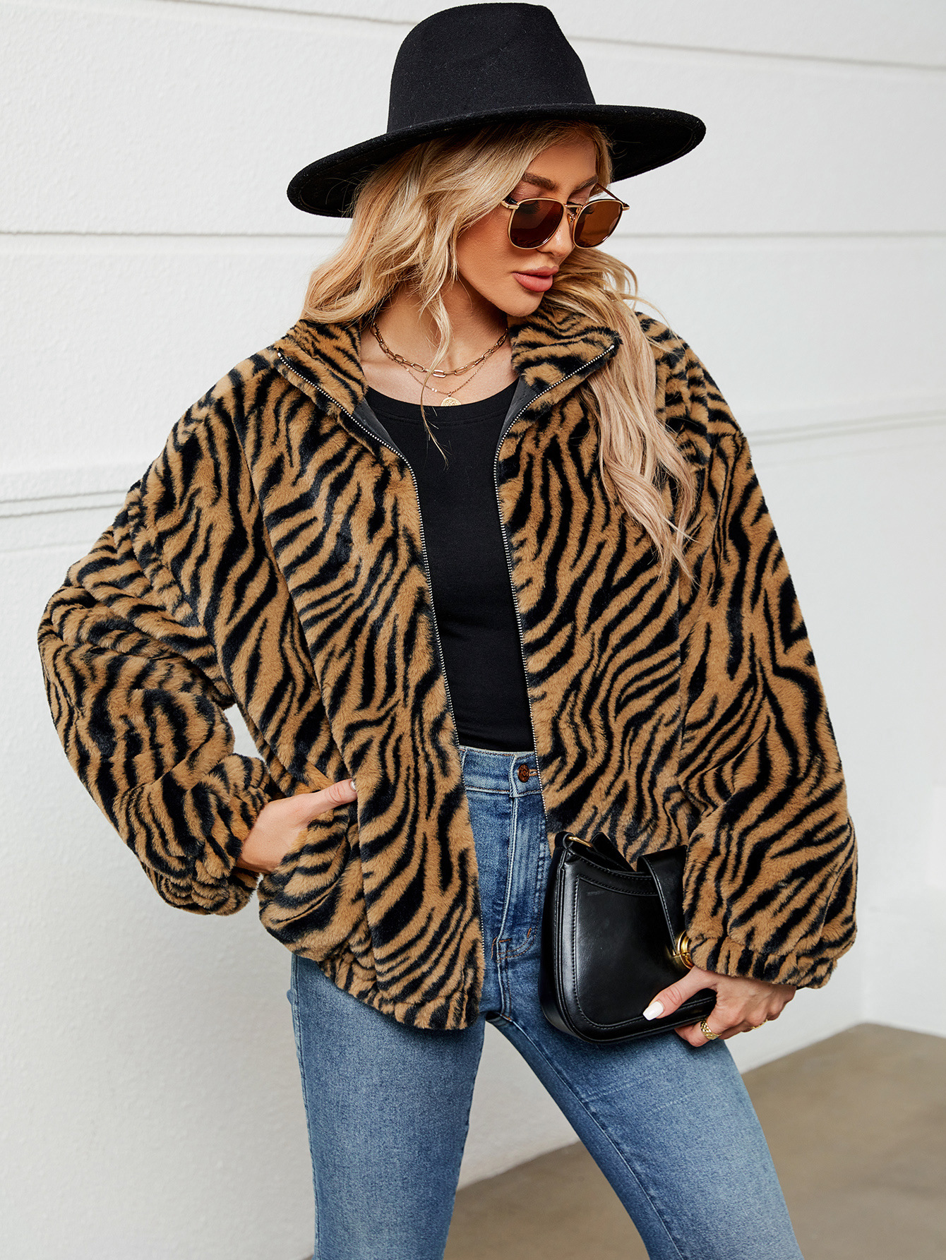 Zebra Pattern Plush Stand Collar Zipper Coat Faux Fur Coat Jacket